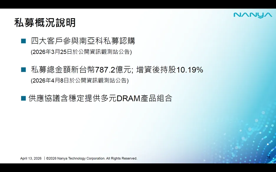 四大客户参与认购,私募总金额新台币787.2亿元,2026年3月公告、4月完成增资持股公告。签订供应协议,稳定提供多元DRAM产品组合。