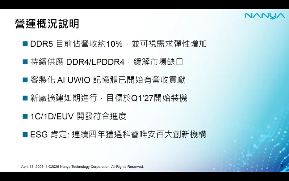 DDR5占营收约10%,可弹性提升;持续供应DDR4/LPDDR4填补市场缺口