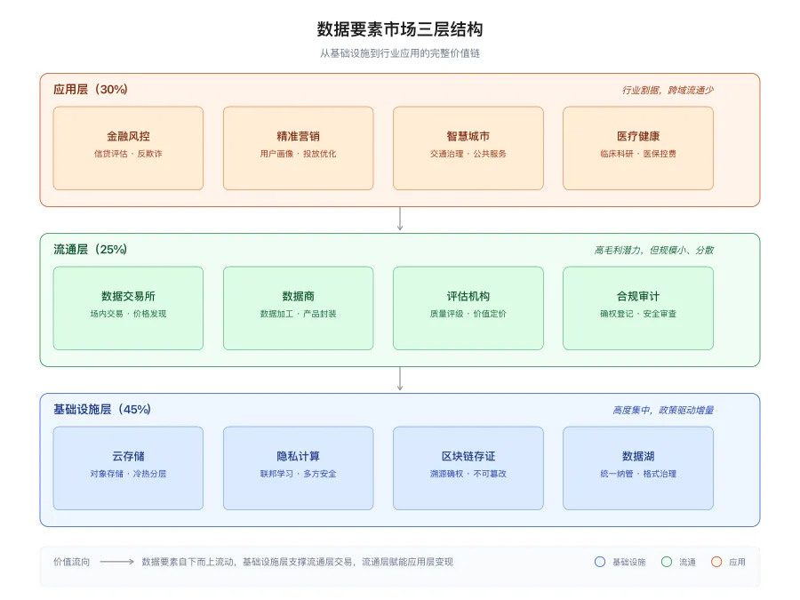 数据要素市场三层结构示意图:底层厚重的基础设施云、中间细窄的流通管道、顶层分散的应用岛屿