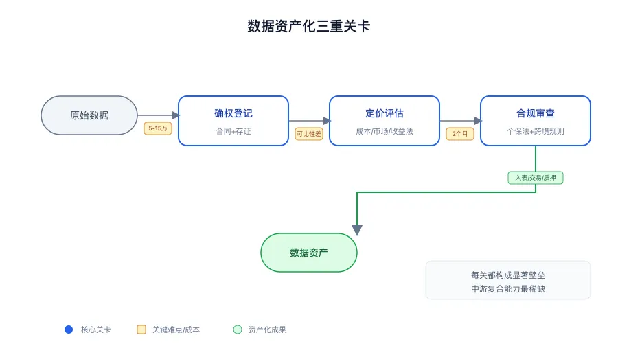 数据资产化的三重关卡流程图:确权、定价、合规三个节点,每个节点标注主要障碍与成本
