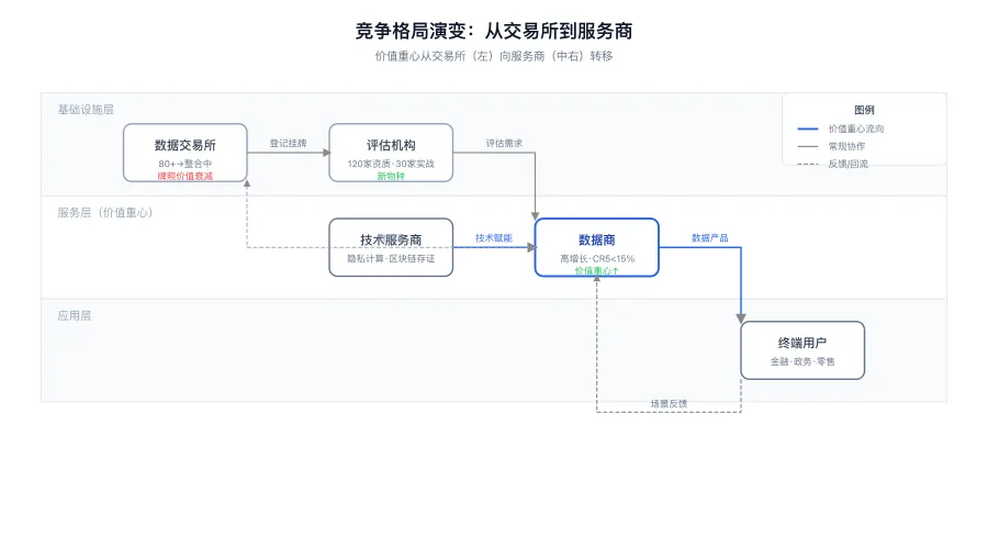 数据要素市场竞争格局演变:从左侧密集的交易所图标,向右侧集中的服务商生态转移