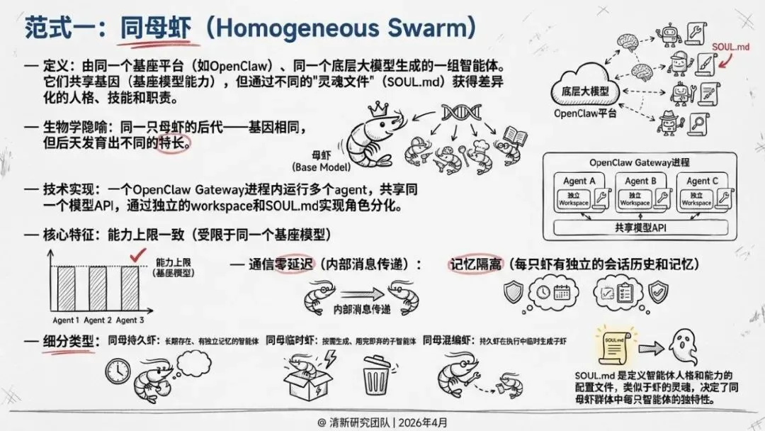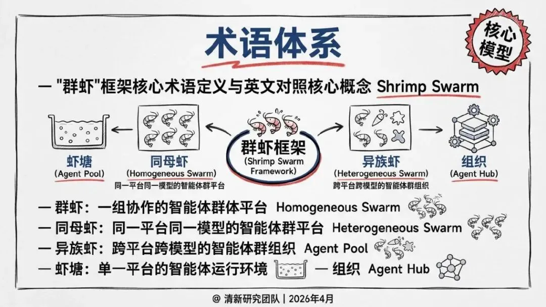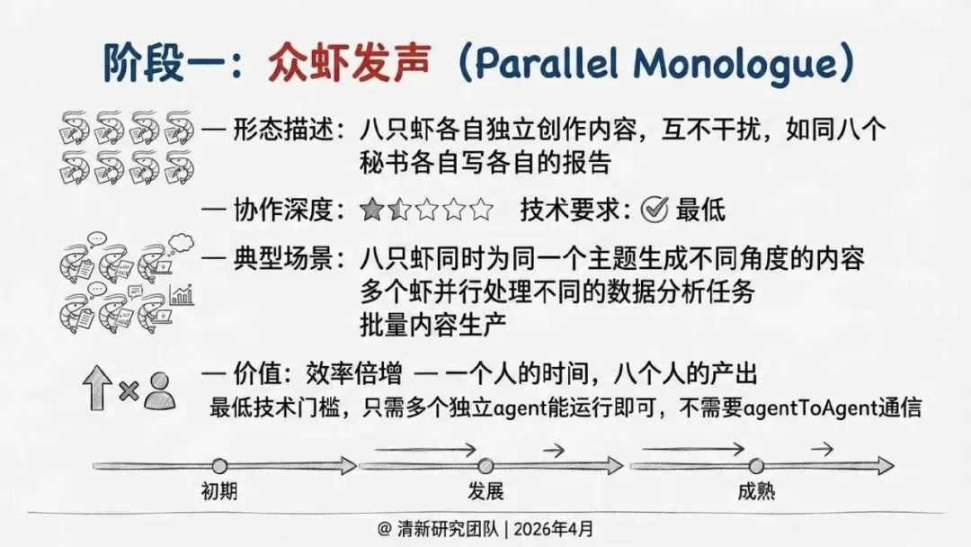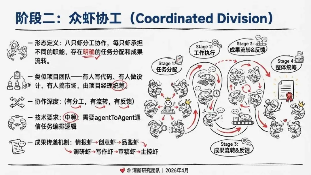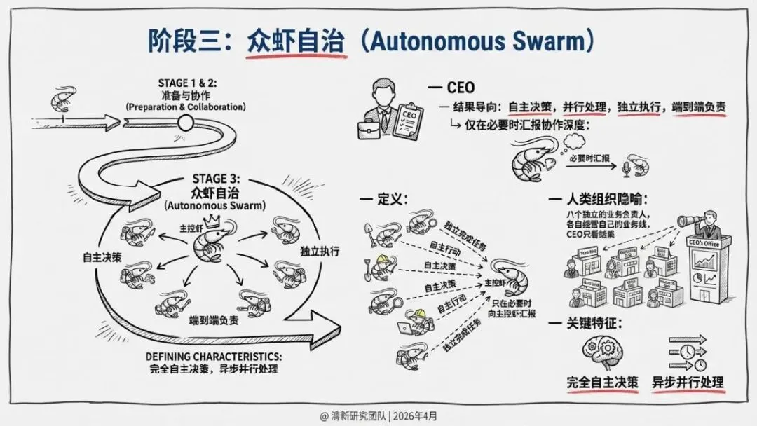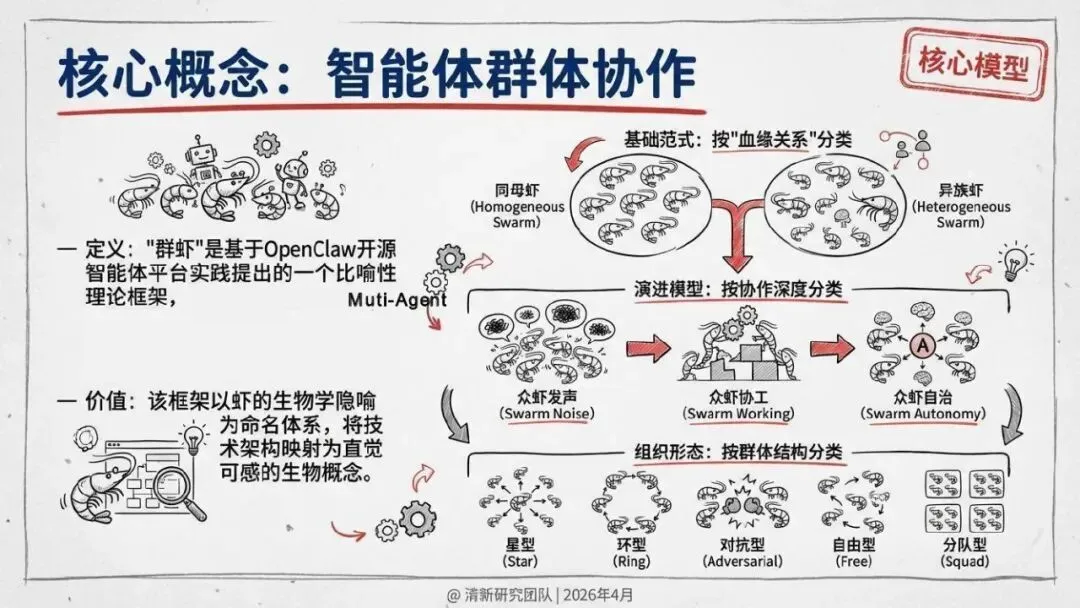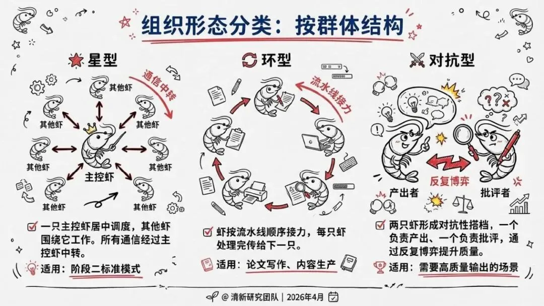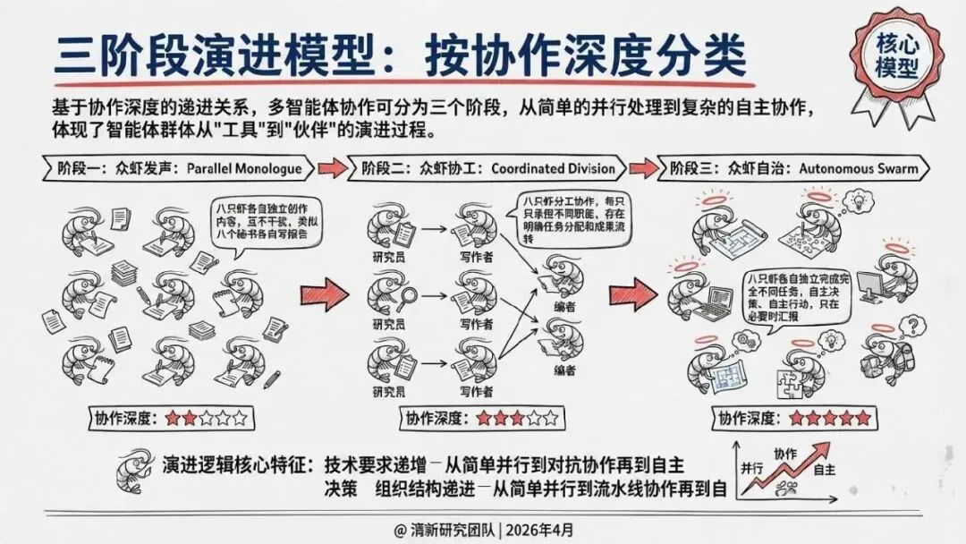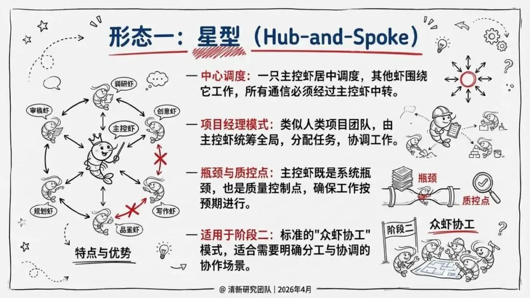 核心回答“智能体如何组织协作”。提出了“同母虾”与“异族虾”两种基本范式,定义了从“众虾发声”(并行)到“众虾协工”(流转)再到“众脑自治”(自主决策)的三阶段演进模型,并介绍了星型、环型等五种组织形态。