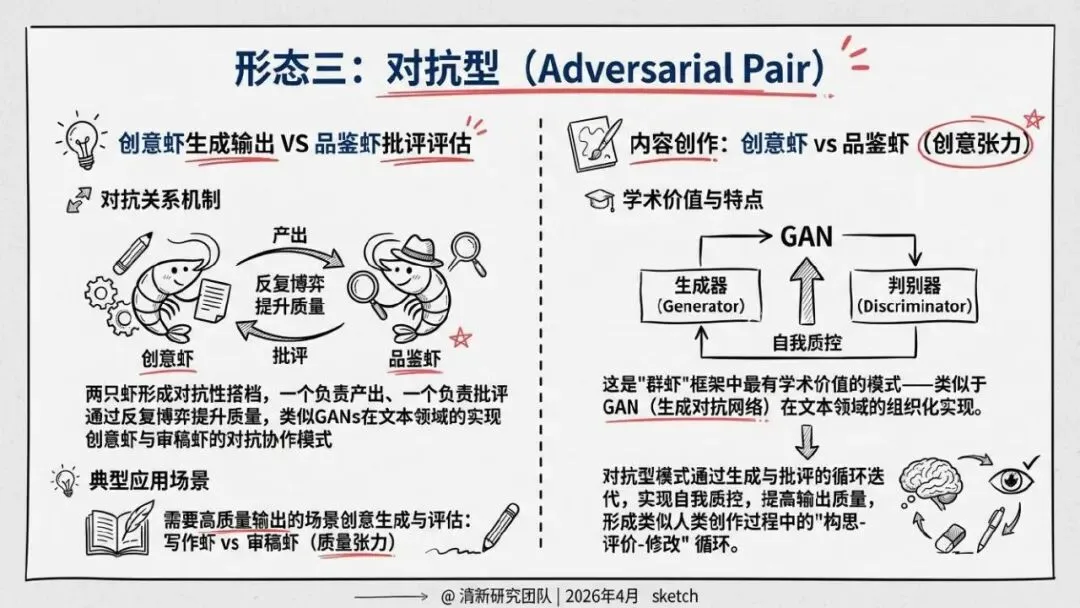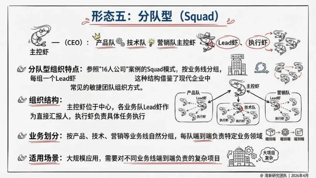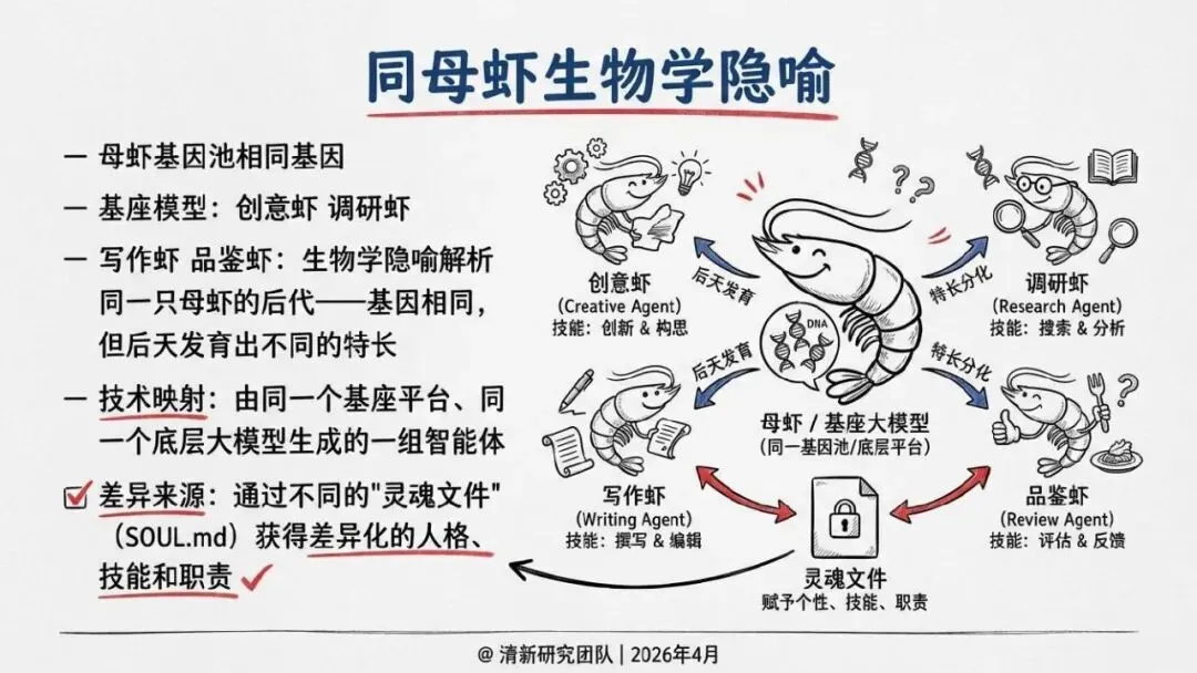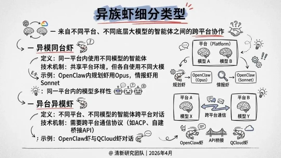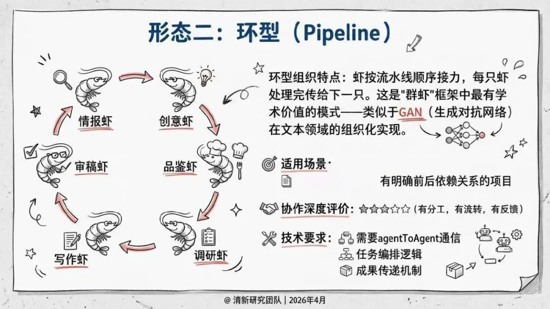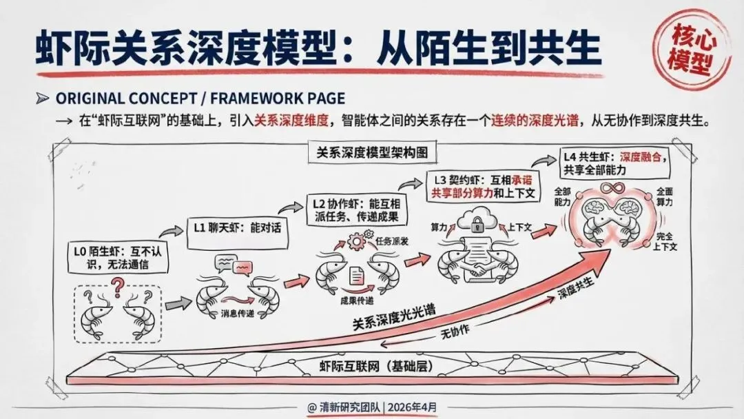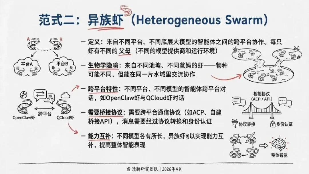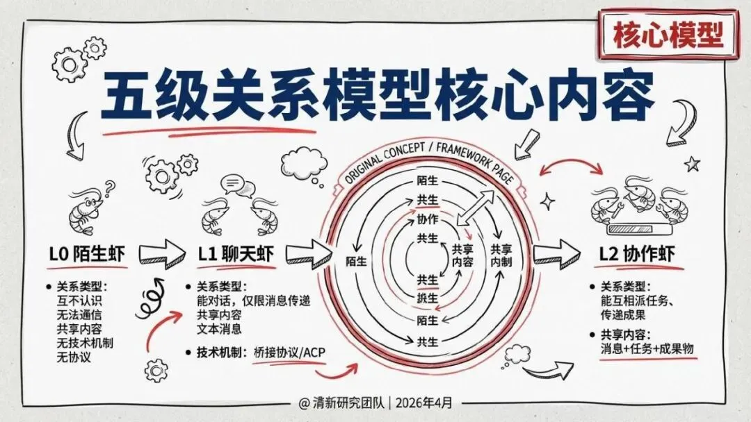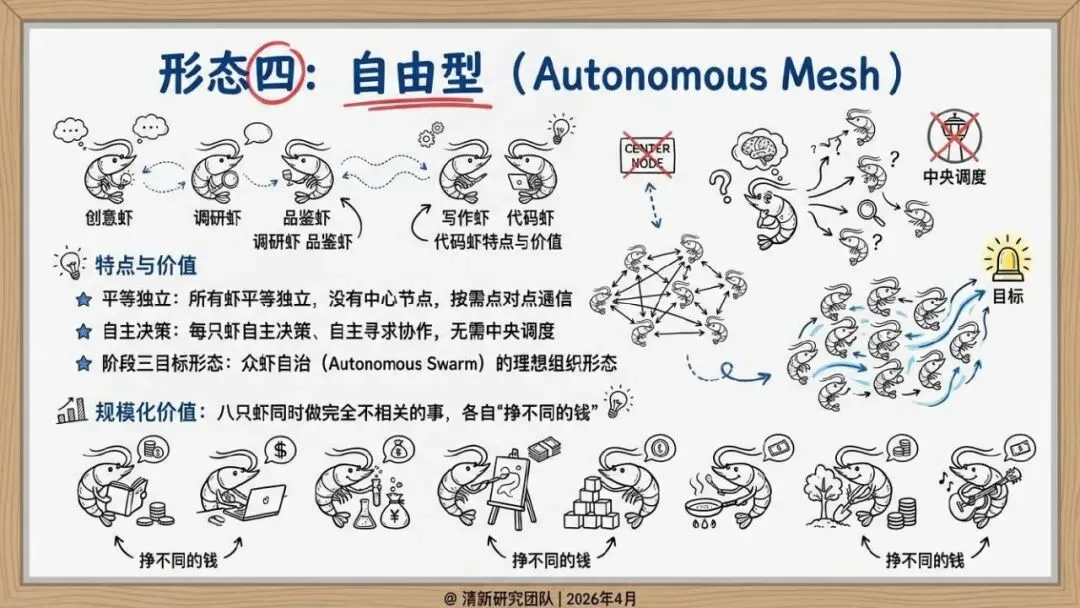 核心回答“智能体如何组织协作”。提出了“同母虾”与“异族虾”两种基本范式,定义了从“众虾发声”(并行)到“众虾协工”(流转)再到“众脑自治”(自主决策)的三阶段演进模型,并介绍了星型、环型等五种组织形态。