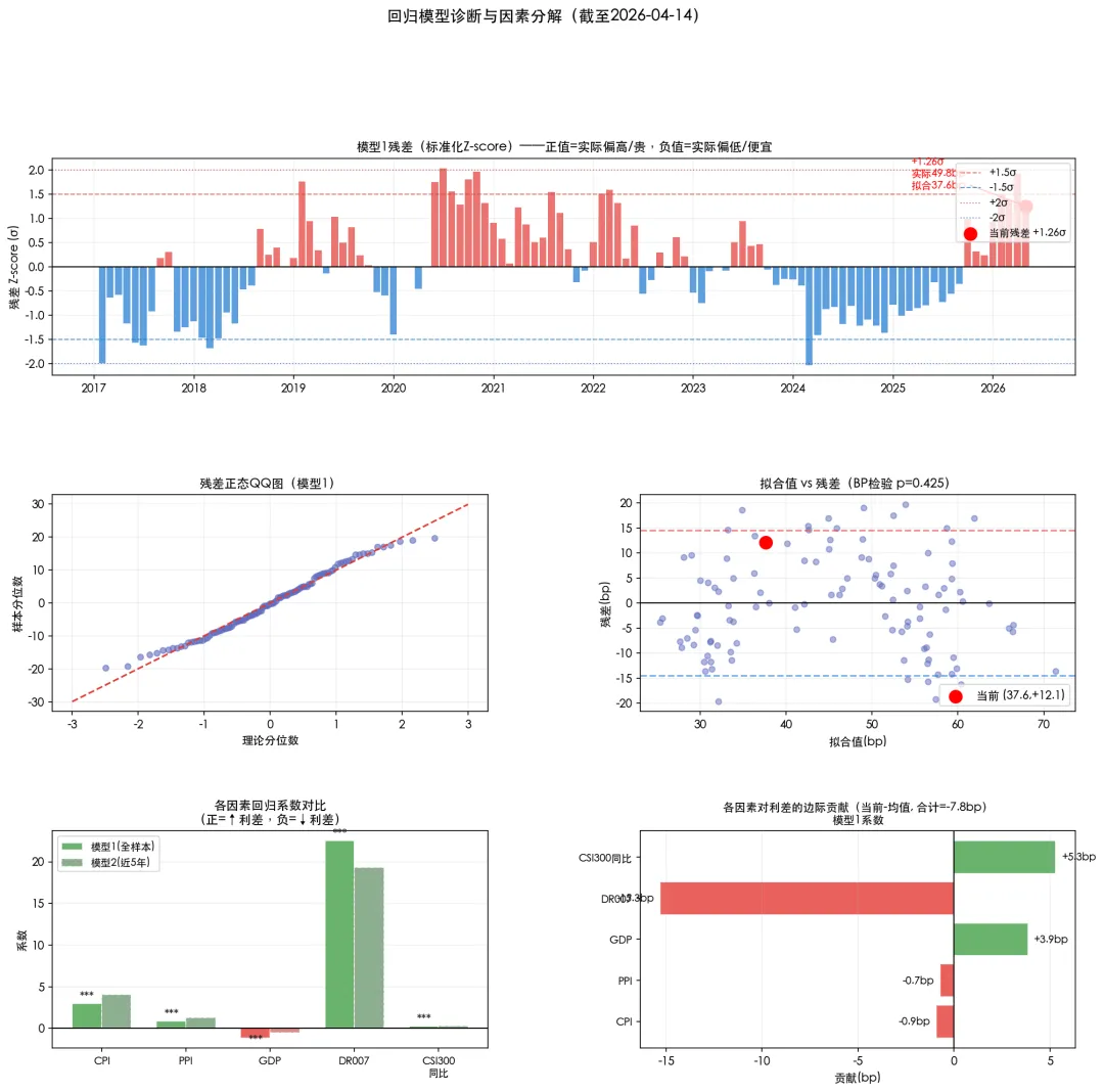 DR007(资金利率)是模型中解释力最强的变量,当前 1.40% 处于历史低位,是支撑利差高于均值的重要因素。
