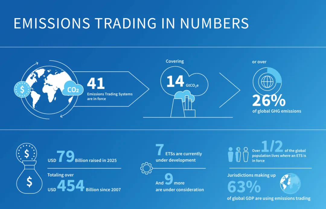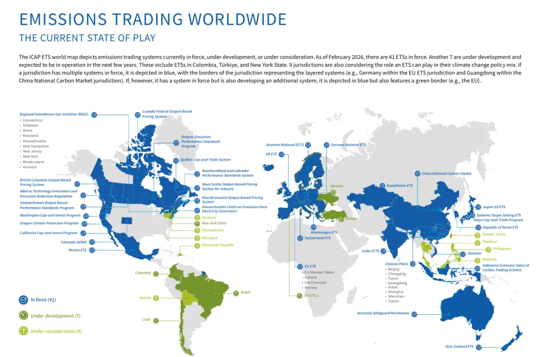 2026 年 4 月15日,ICAP 发布最新版《全球碳市场进展报告 2026》,覆盖41 个在运行碳市场、16 个在建 / 拟建市场,横跨电力、工业、建筑、交通、航运、航空全领域。