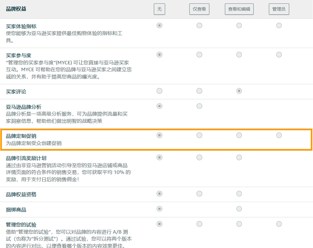 如果您看到权限错误页面,请让主用户通过访问“亚马逊卖家平台>设置>用户权限>管理全局权限>品牌权益>品牌定制促销”,给予“查看和编辑”或者“管理员”权限来授予您访问权限。