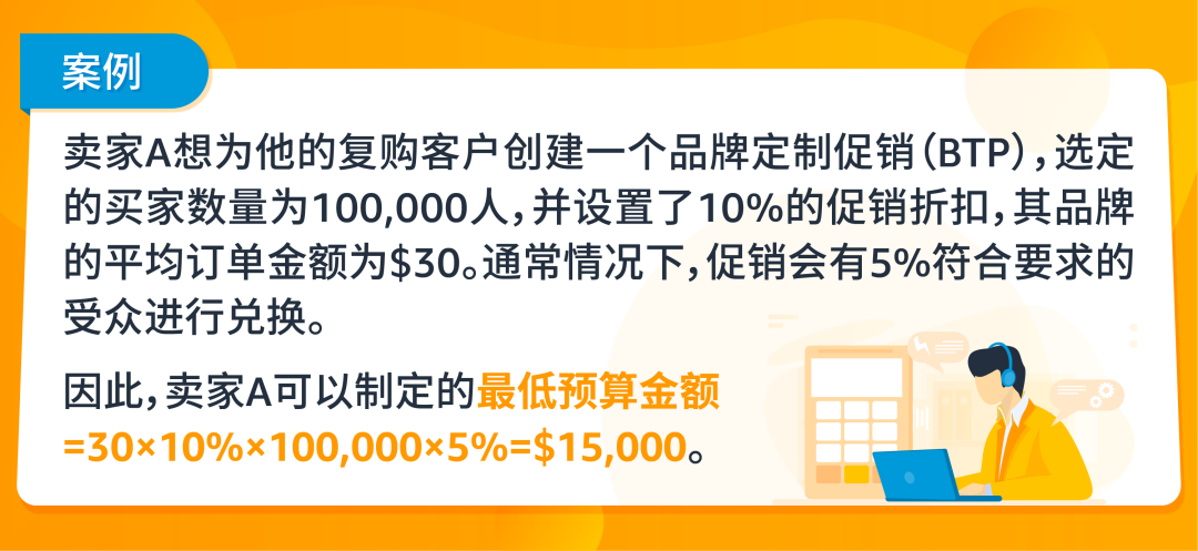 最低预算金额=品牌的平均订单金额×折扣百分比×所选受众群体中的买家数量×促销兑换率