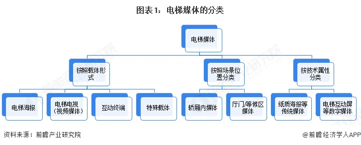 电梯媒体按照载体形式分类,可以分为电梯海报、电梯电视(视频媒体)、互动终端、特殊载体;按照场景位置分类,可以分为轿厢内媒体、厅门/等候区媒体;按技术属性分类,可以分为纸质海报等传统媒体以及电梯互动屏等数字媒体。