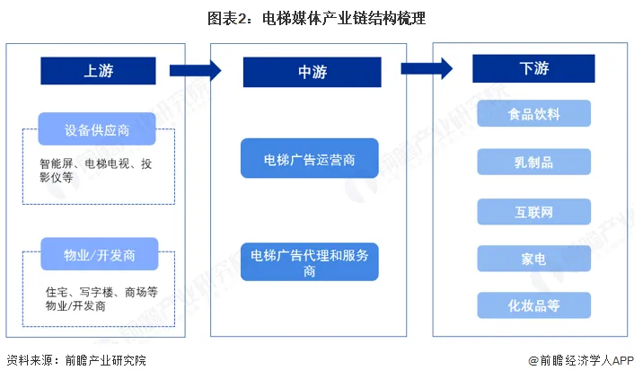 中国电梯媒体行业产业链上游为硬件设备供应商和物业开发/管理公司;中游主体为电梯媒体运营企业;下游主体为各行业客户。