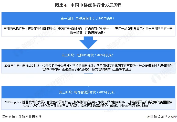 中国电梯媒体行业的发展历程大致可分为电梯海报时代、电梯 LCD 时代、电梯智能屏时代三个阶段。近年来,智能屏由于视频效果好,在电梯媒体领域应用增加。
