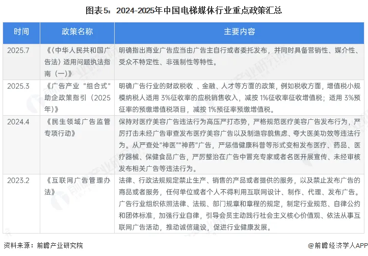 近年来,国家相继发布《〈中华人民共和国广告法〉适用问题执法指南(一)》《互联网广告管理办法》等政策,完善监管体系,同时在税收、金融、人才培养等方面推动电梯媒体在内的媒体广告行业发展。