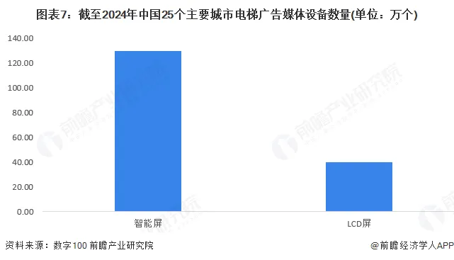 数字100发布的《2024年度中国电梯视频广告TOP25城监测报告》显示,截至2024年,中国25个主要城市电梯智能屏数量已经达到130万个,LCD屏在40万个左右。