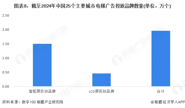 根据数字100发布的《2024年度中国电梯视频广告TOP25城监测报告》,2024年25个主要城市智能屏投放广告品牌数量达到1.50万个,LCD投放广告品牌数量达到0.46万个,合计接近2万个。