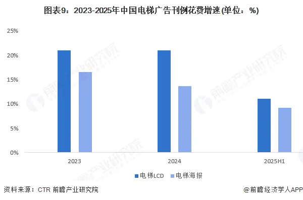 根据CTR媒介智讯的数据,2023-2024年中国电梯LCD和电梯海报广告刊例花费增速均在10%以上,2025年上半年,电梯LCD广告刊例花费增速超过10%,电梯海报广告刊例花费增速在9%左右,保持在较高水平。