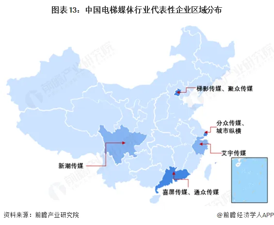 电梯媒体行业代表性企业主要分布在广东、四川、上海、北京等省份,其中分众传媒等位于上海,新潮传媒位于四川,广东省拥有喜屏传媒、通众传媒等企业,北京有梯影传媒等代表性企业。