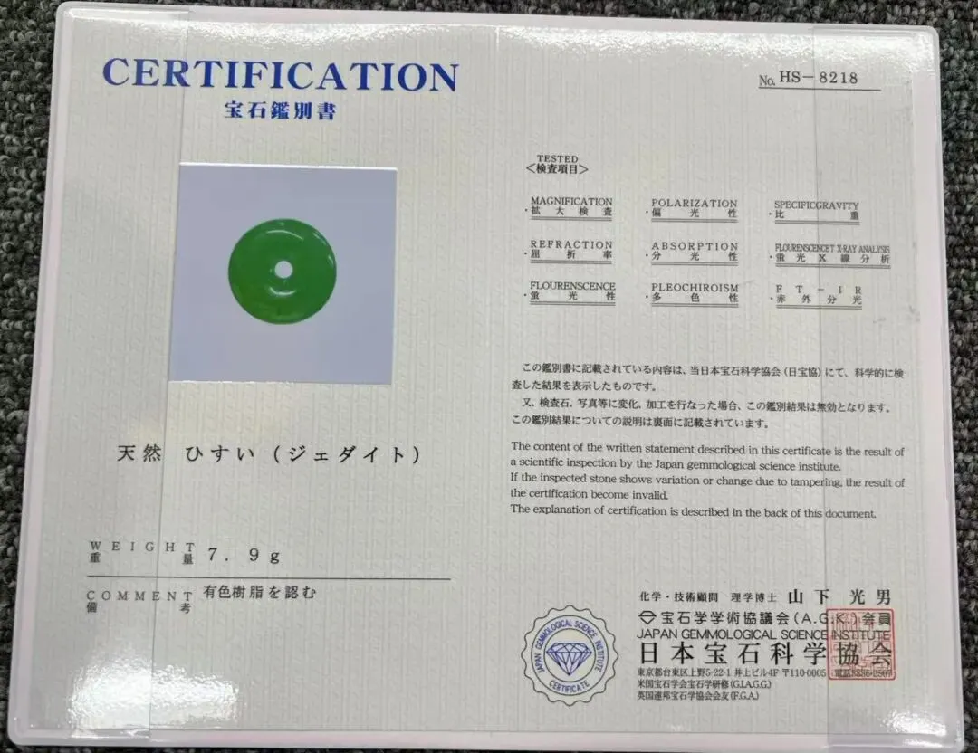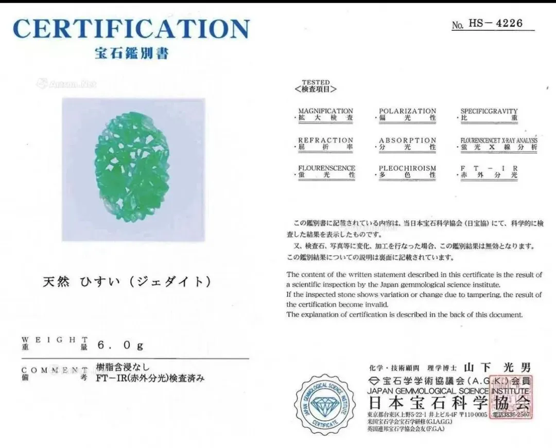 日本宝石科学协会JGSI ,山下光男博士,关于老翡翠的鉴定结论是:天然翡翠,但是加了备注——合成树脂含浸处理,或者有色树脂含浸处理,与日本国中央宝石研究所CGL的结论一样,都是根据是日本分光株式会社FT/IR-4100。