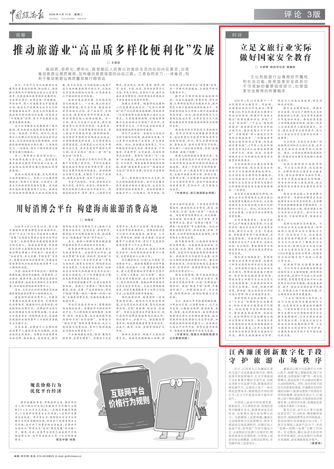2026年4月15日是第十一个全民国家安全教育日。司法部、全国普法办近日印发通知,部署开展2026年全民国家安全教育日普法宣传活动,明确今年活动主题为“统筹发展和安全 护航‘十五五’新征程”。“十五五”规划纲要提出“推进国家安全体系和能力现代化,建设更高水平平安中国”,并强调要“深入推进文化市场综合执法改革”,“加强旅游市场综合监管和安全管理,改善旅游消费体验”。《中华人民共和国国家安全法》亦从法律层面明确了维护文化、网络、社会、生态等领域安全以及加强全民国家安全教育的制度要求。