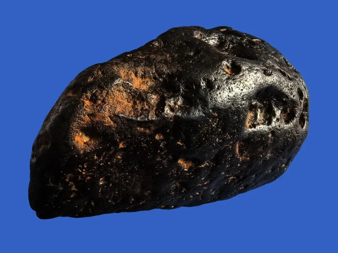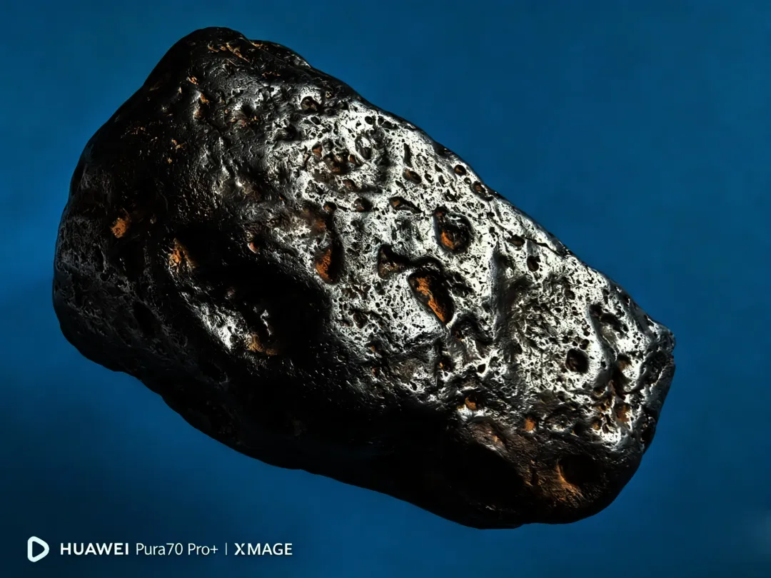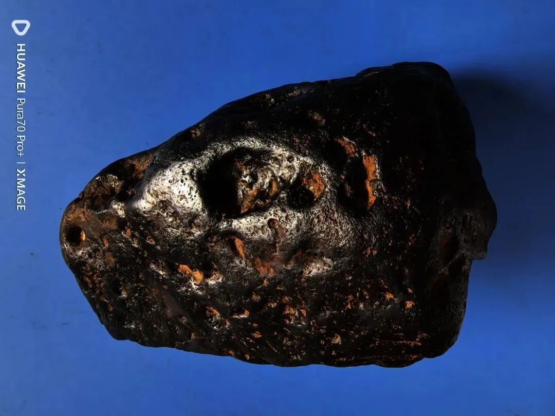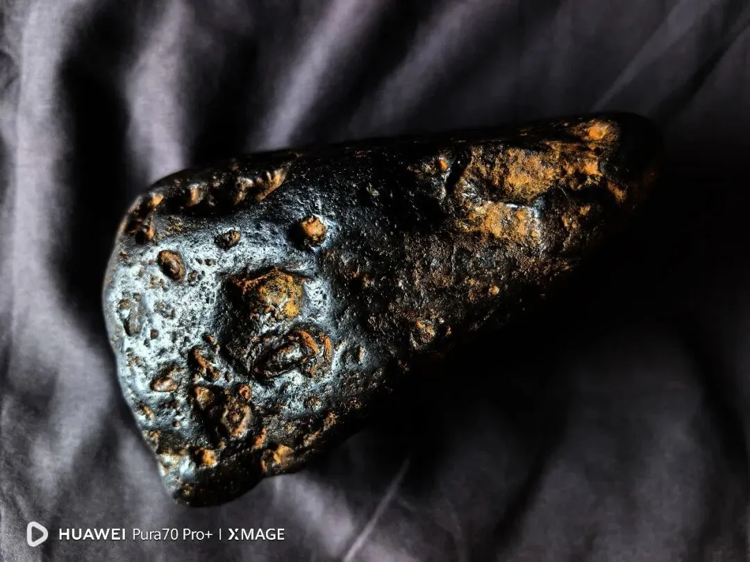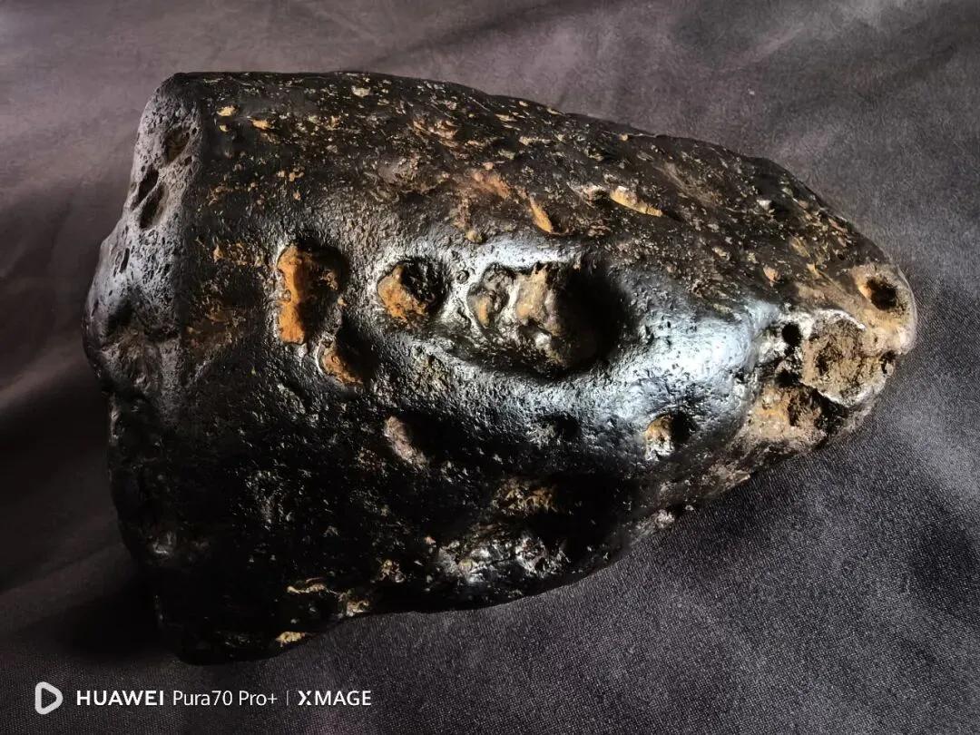 陨石主体色泽为纯黑色,表面色泽均匀,无明显杂色分布,该黑色源于陨石穿越地球大气层时,表面物质经高温熔融、冷却后形成的熔壳,是陨石经历大气烧蚀的直接外观体现;样本表面附着有棕黄色附着物,经初步分析,该附着物为陨石陨落至金沙江岸边后,长期受江水冲刷、泥沙浸润形成的次生附着层,非陨石原生成分。