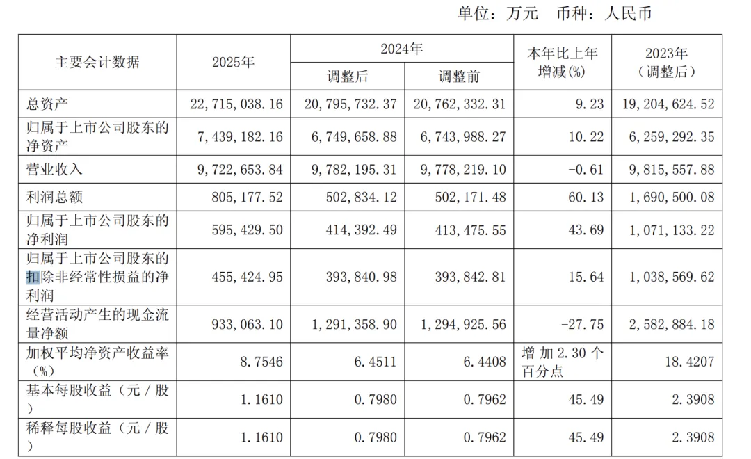 2025 年度,营业收入 972.26亿元,营业利润81.59亿元,利润总额80.52亿,归母净利润59.54亿元,同比分别-0.61%、+67.18%、+60.13%、+43.69%。