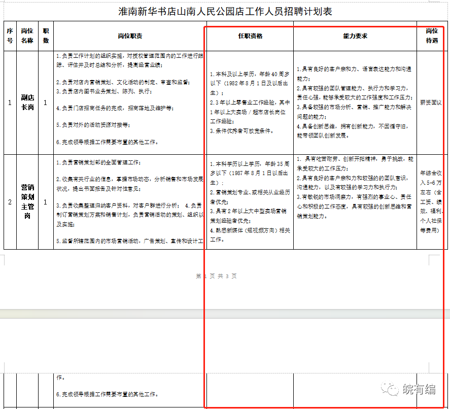 (一)聘用手续和待遇:本次招聘岗位聘用后,副店长和主管岗位与淮南新华书店有限公司建立劳动关系;营业员岗位与安徽楚杨人力资源服务有限公司建立劳动关系;聘用的工资待遇按淮南新华书店有限公司薪酬制度执行。