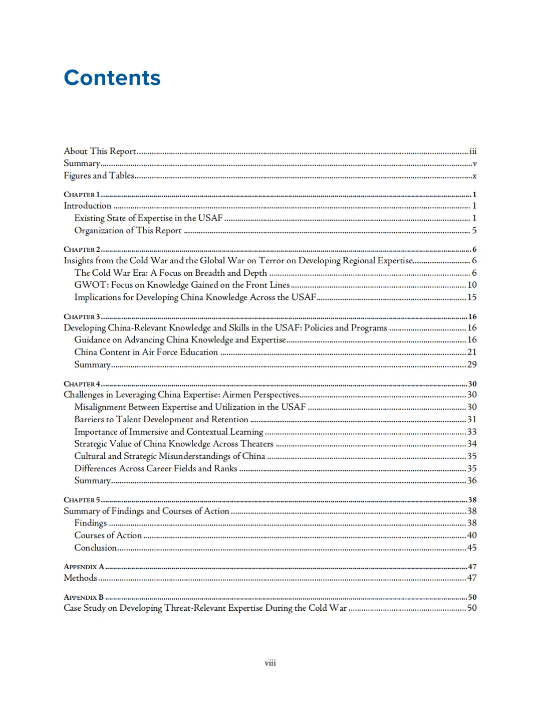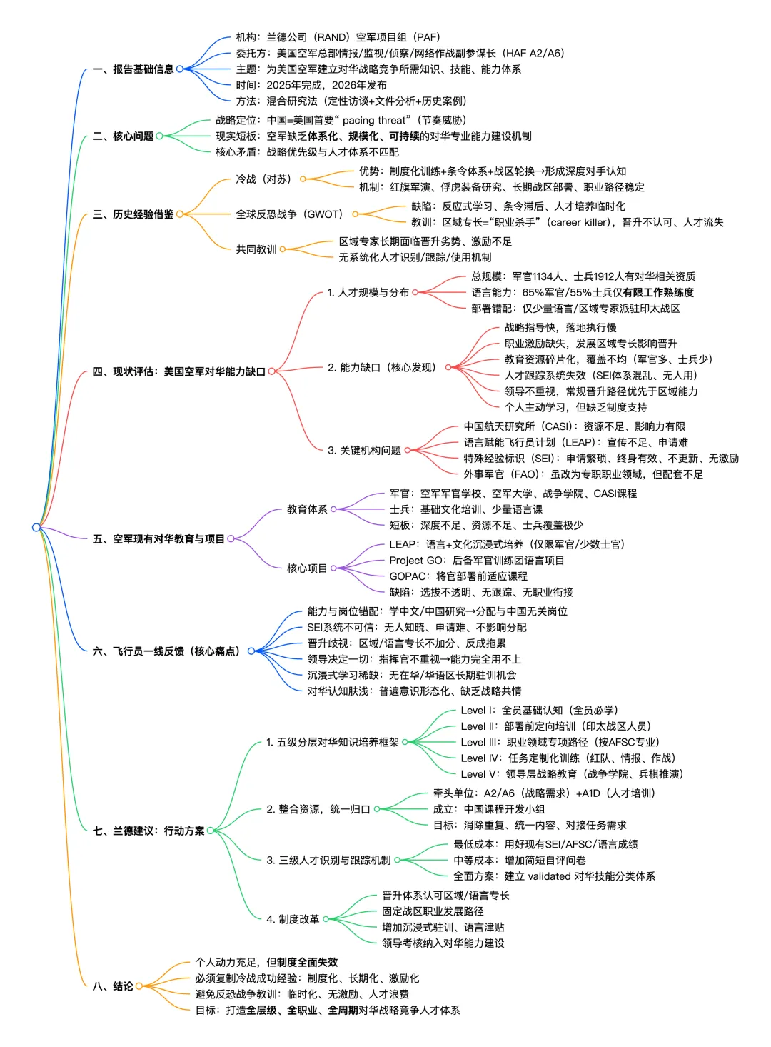 报告由兰德“空军项目”团队完成,研究资助方为美国空军总部负责情报、监视侦察与网络效应行动的 A2/A6 部门。研究团队综合使用历史案例研究、政策分析、制度梳理、教育项目审查、行政数据分析和访谈等方法,试图回答一个核心问题:美国空军究竟需要什么样的涉华能力,以及应通过何种人事与教育机制把这种能力真正建起来。报告显示,美空军当前并非完全缺乏懂中国的人才,而是缺少一套能够把相关人才“找出来、用起来、留得住”的制度闭环。