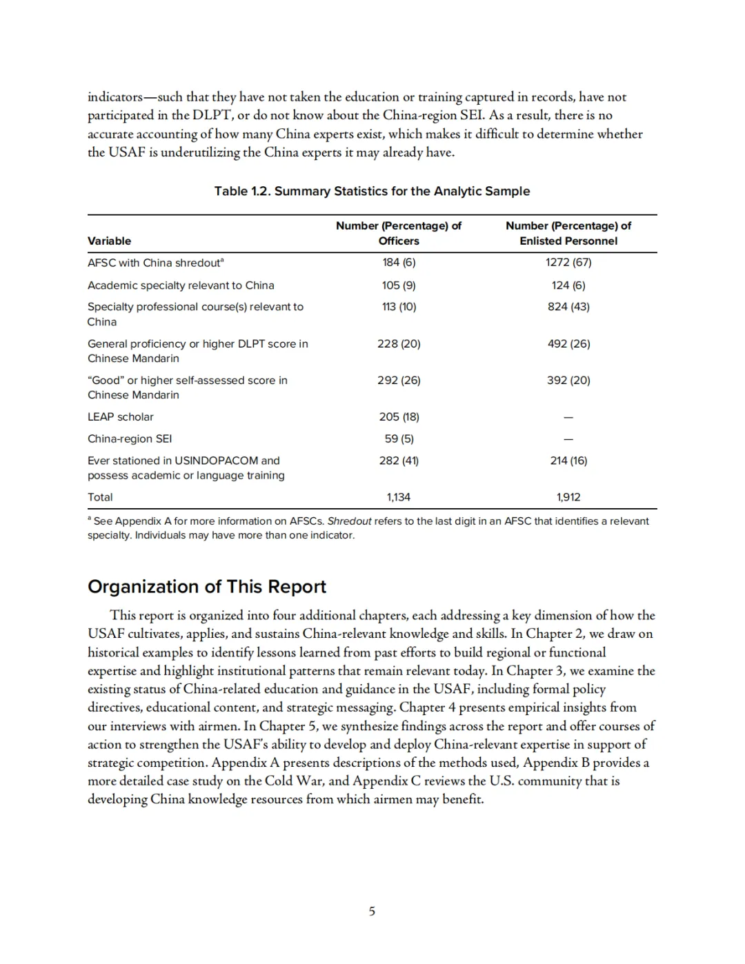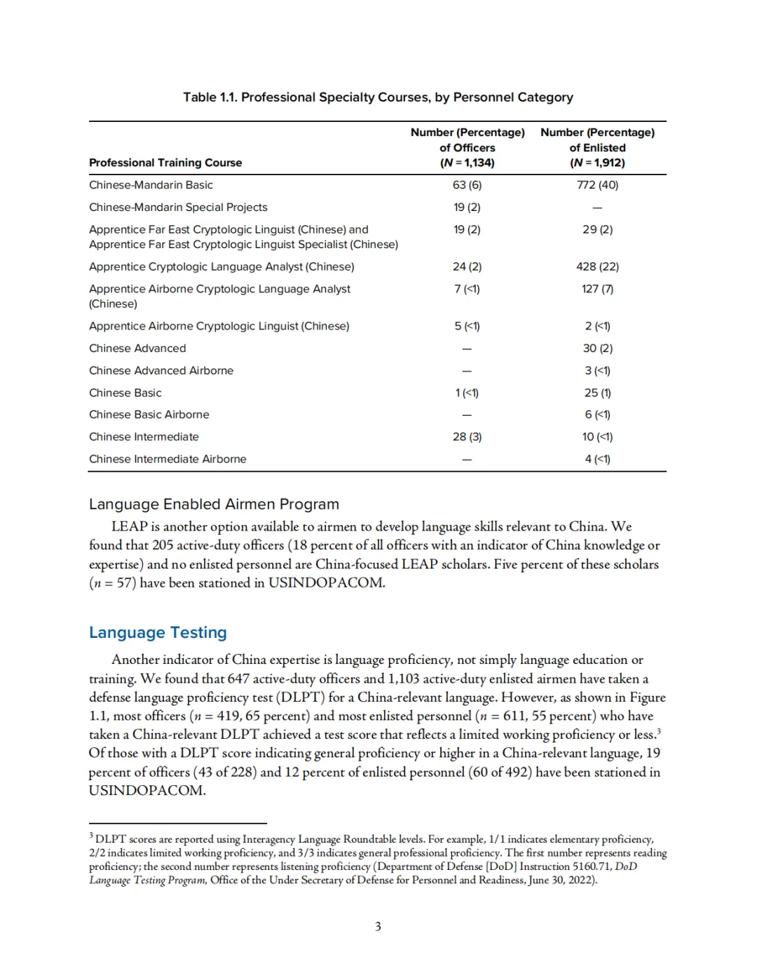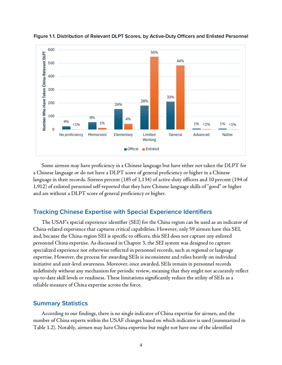 从现实基础看,报告对美空军现有涉华能力做了较为细致的盘点。研究将涉华能力分解为多个观察指标,包括涉华学术背景、涉华专业课程培训、语言启用飞行员计划参与情况、中文防务语言水平测试成绩、涉华特殊经验标识以及印太地区任职经历等。结果显示,这些能力在人员体系中分布零散、彼此割裂,难以形成系统画像。报告特别指出,即便部分军官和士兵具备中文、区域研究或印太任职背景,也并不意味着他们会被优先配置到与中国问题密切相关的岗位上,人才储备与岗位需求之间存在明显脱节。