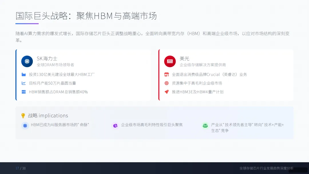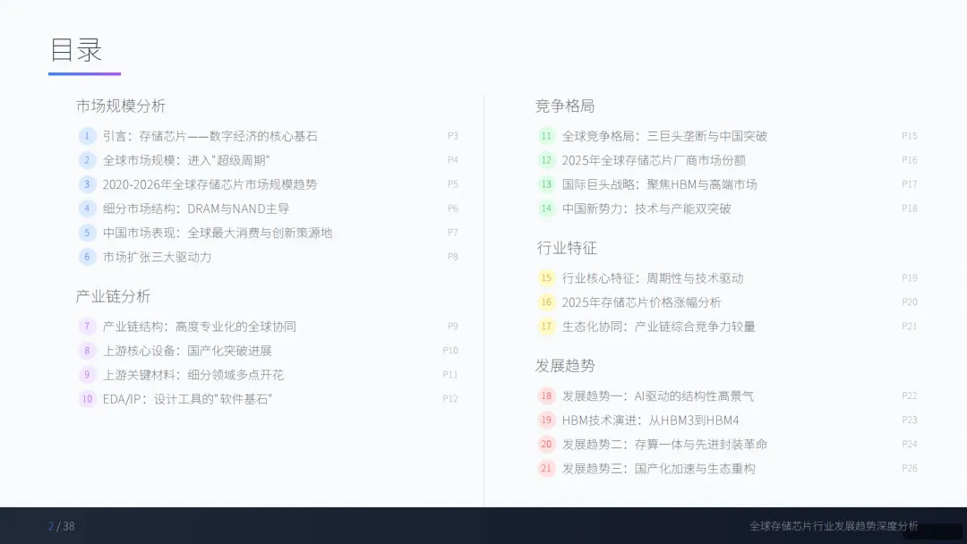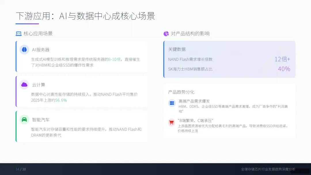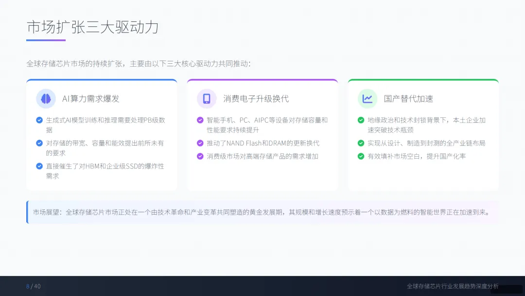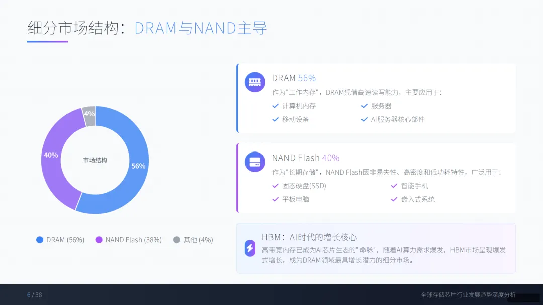 HBM向高端化快速推进,HBM4将成为AI服务器标配,带宽与容量实现翻倍增长。存算一体技术逐步落地,尝试打破传统冯·诺依曼架构的数据搬运瓶颈。Chiplet、2.5D与3D堆叠等先进封装技术成为性能提升关键,封装环节跃升为行业核心竞争战场。此外,DDR5迭代、3D NAND向更高堆叠层数升级,高密度、高能效产品持续主导高端市场。