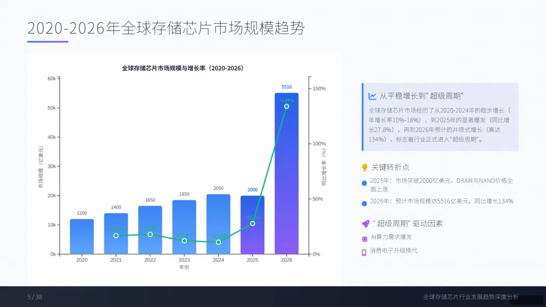 生成式AI的训练与推理环节,对存储的带宽、容量和能效都提出了极高要求。单台AI服务器的存储需求是传统服务器的8到10倍,NAND需求更是提升12倍以上。再加上云计算持续投入、消费电子产品不断升级,多重因素共同推动行业进入高增长阶段,2026年市场规模同比增幅达到134%。