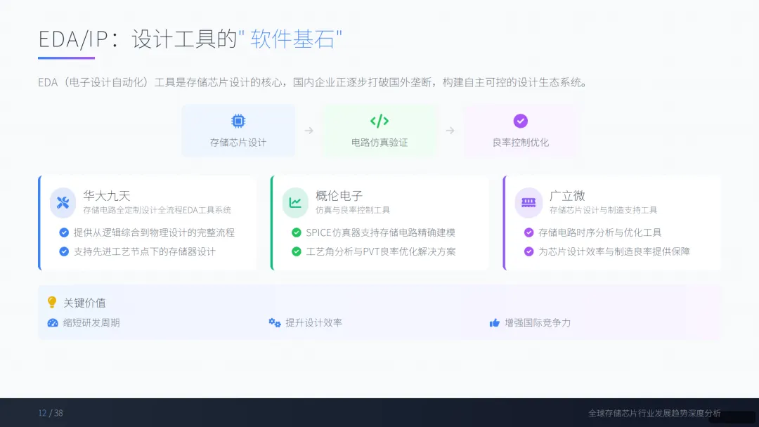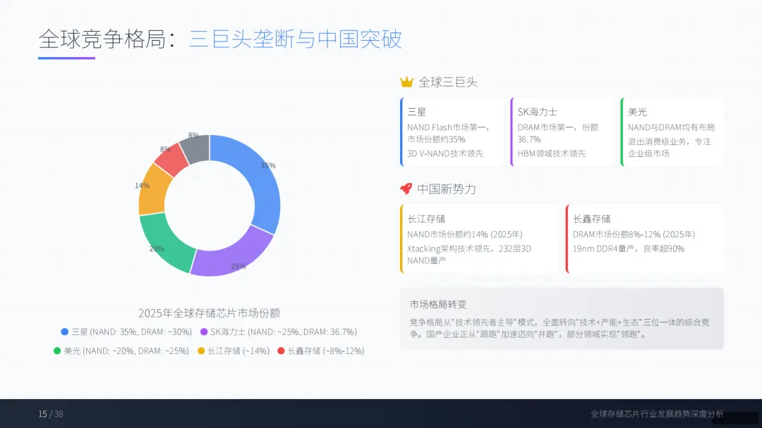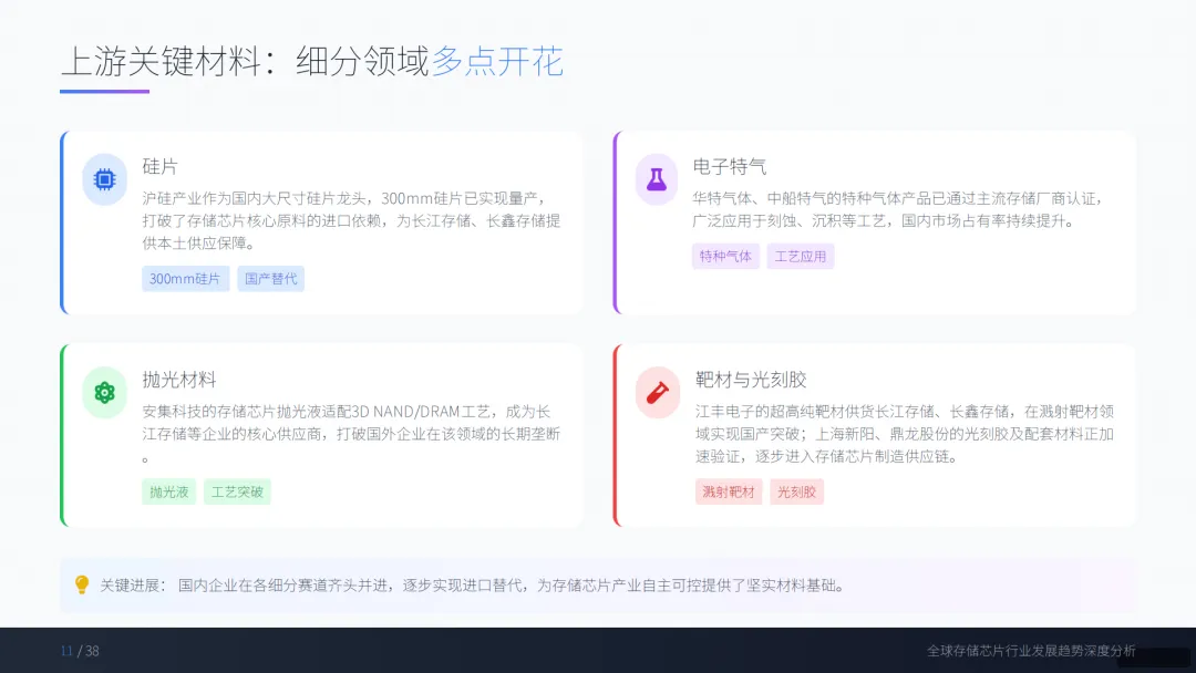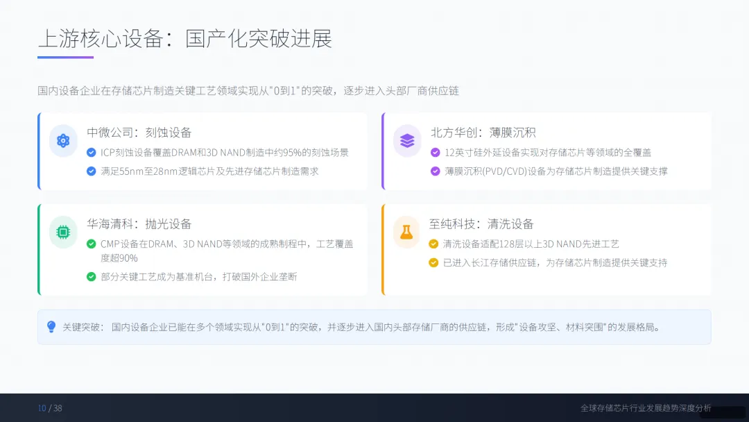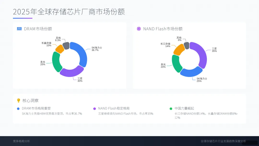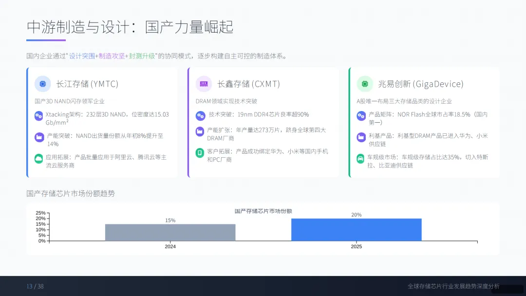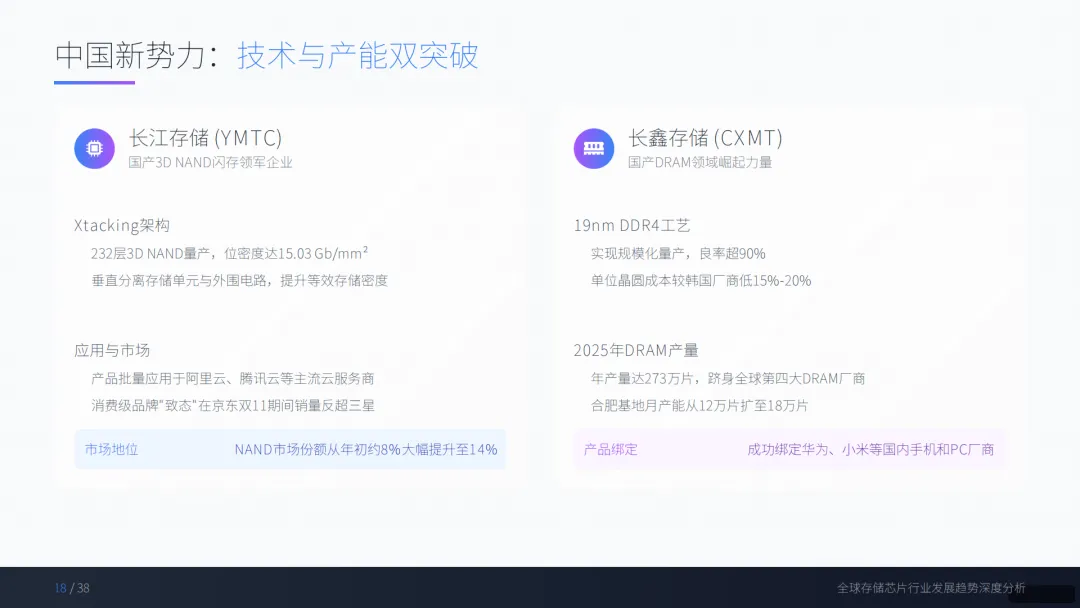 长江存储在232层3D NAND技术上站稳脚跟,长鑫存储的19nm DDR4产品良率稳定超90%。市场份额上,长江存储NAND占比达14%,长鑫存储DRAM份额在8%到12%之间。成本方面,长鑫存储晶圆成本比韩国厂商低15%至20%。同时国内设备、材料、EDA等环节逐步突破,国产存储芯片也顺利进入全球头部厂商供应链。