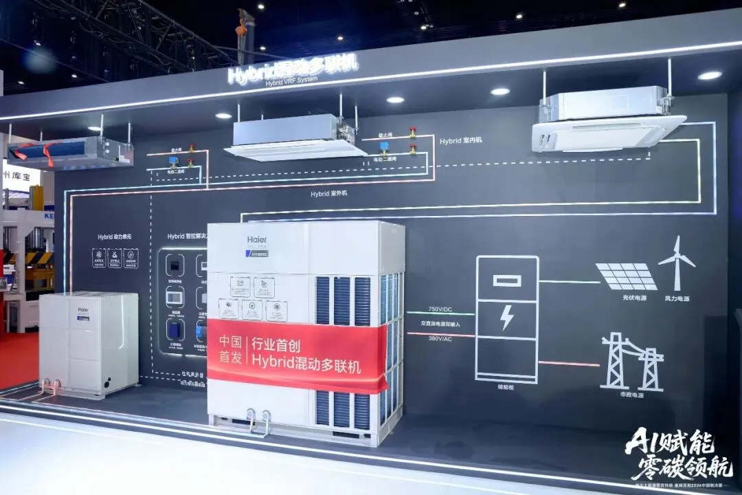 以用户需求为中心,体验升级永不止步。海尔敏锐捕捉到商用场景中用户操作、舒适、安装等全流程痛点,加速新品迭代,在 AI 多联机智慧能力之上,推出行业首创Hybrid混动多联机,采用水氟混动技术,实现氟不入户,从源头规避冷媒泄漏风险,带来柔和静音体验;依托交直流混动架构,可接入光伏等多元能源,支持0电费运行,有效降低用电成本;联动智能通讯实现智慧运维,降本增效。同时,通过技术创新完成R410A向R32冷媒迭代,兼顾高能效与环保属性,深度契合双碳战略与新冷媒替代趋势。