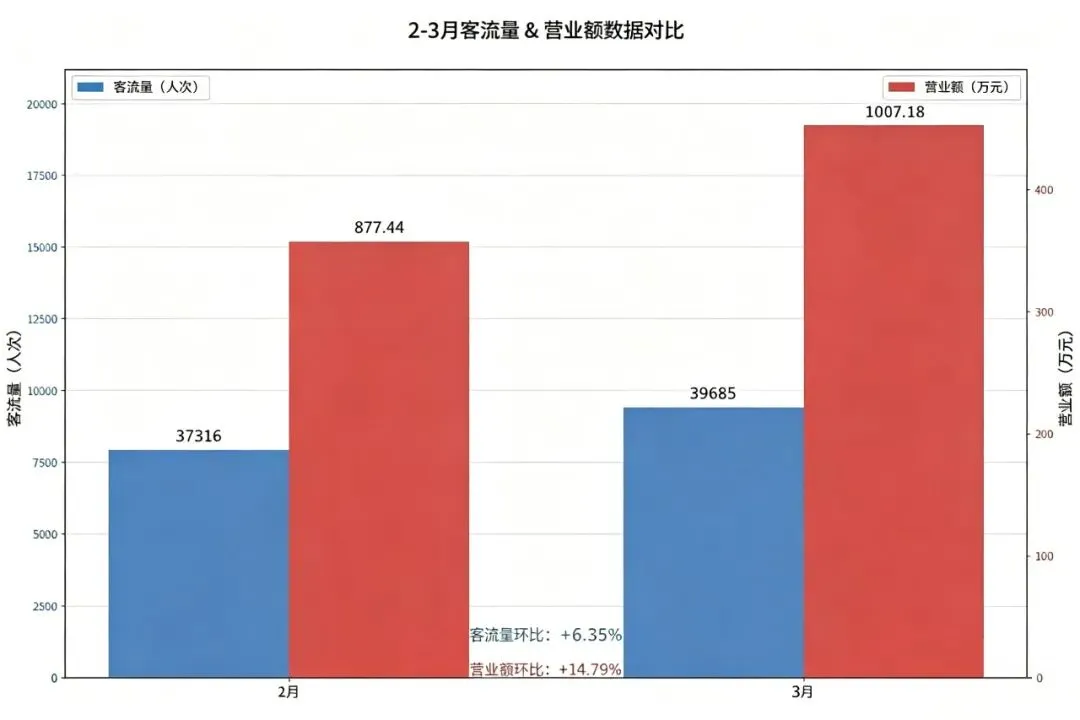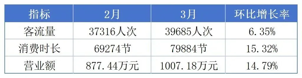 3月总客流量达39685人次,较2月的37316人次环比增长6.35%,客流规模稳步扩张,反映出卡丁车运动的大众参与度有所提升;3月赛道实际消费总时长为79884节,对比2月的69274节环比增长15.32%,消费时长的增幅远超客流量增幅,说明消费者单次消费的参与深度有所增加;3月总营业额达1007.18万元,较2月的877.44万元环比增长14.79%,营收增长与消费时长增长趋势基本一致,行业经营效益实现实质性提升。