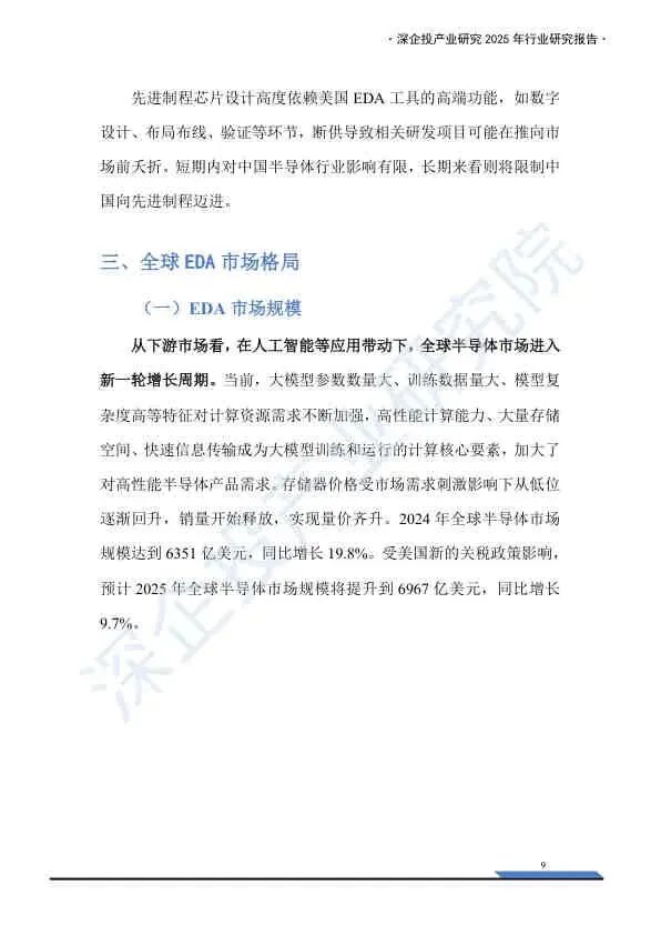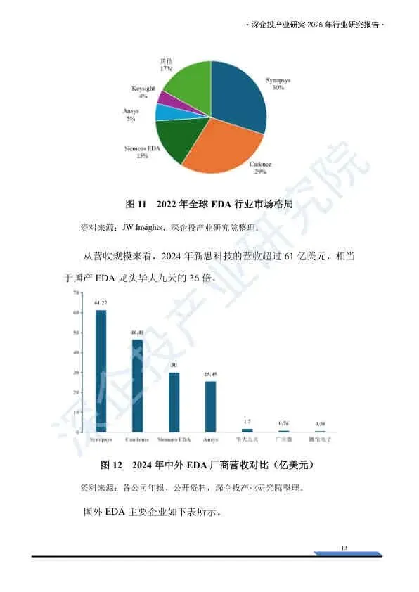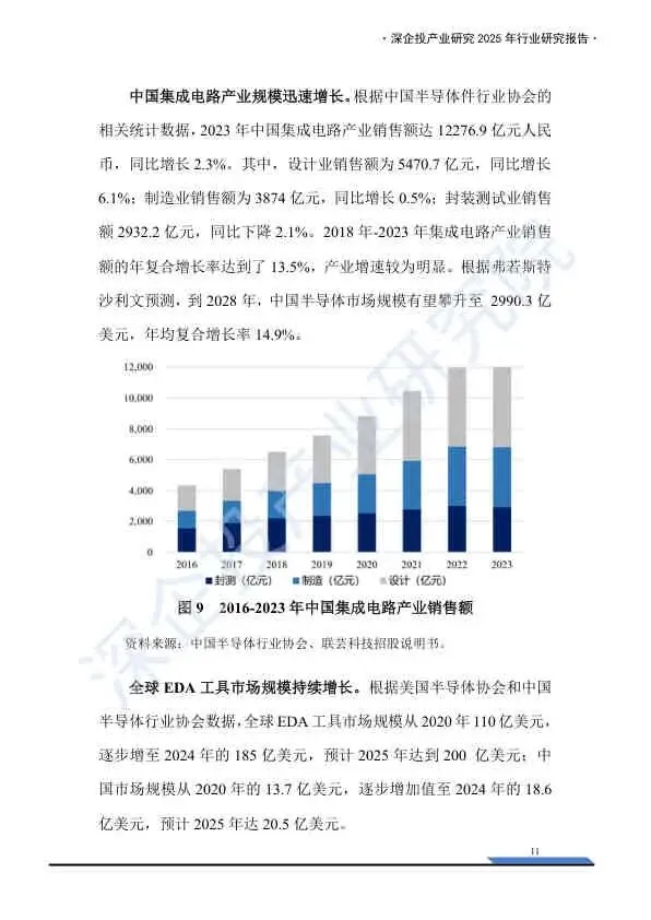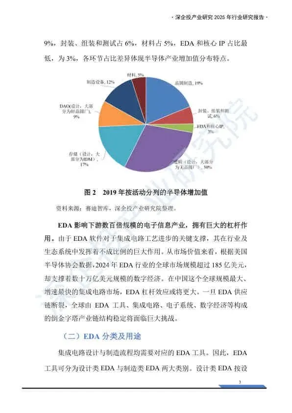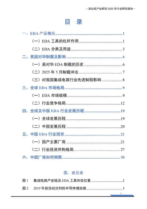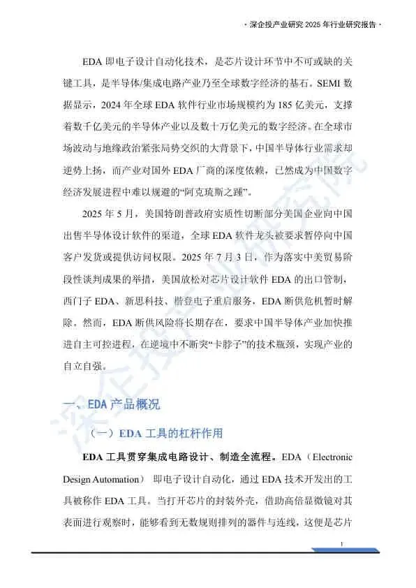 这份《2025中国EDA行业研究报告》由深企投产业研究院发布,基于2025年的产业背景,深入剖析了中国电子设计自动化(EDA)行业的宏观环境、市场格局、技术演进及国产化突围路径。报告重点分析了美国制裁下的供应链风险,并详细梳理了国内厂商的竞争态势与资本布局。以下是核心内容总结: