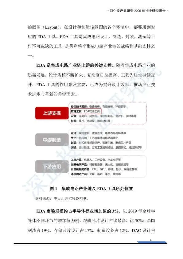 - 核心作用:EDA(Electronic Design Automation)是集成电路设计、制造、封装不可或缺的工具,是贯穿产业链的战略性支柱。