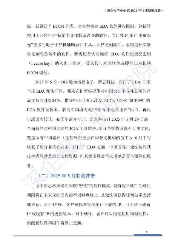 - 关键节点:2025年5月,美国BIS要求新思科技、楷登电子、西门子EDA暂停对中国客户的服务与升级。新思科技采用年度密钥模式,导致客户在355天内面临工具失效风险。