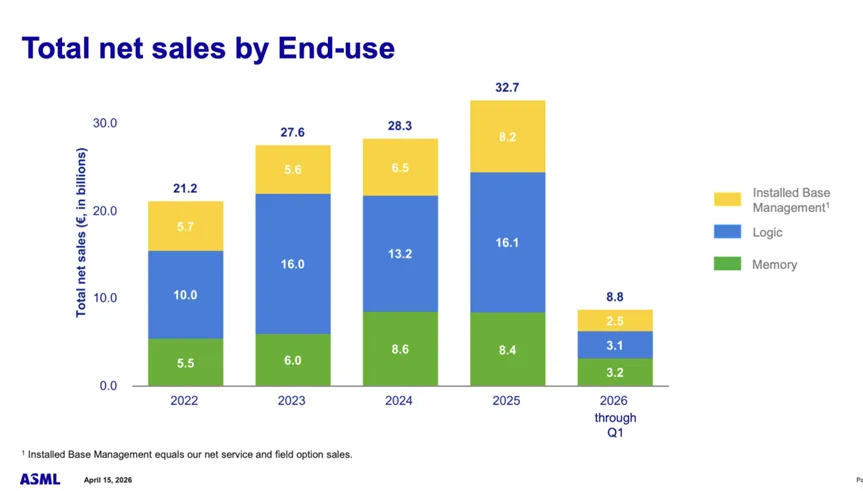 财务数据显示,2026年第一季度,ASML实现净销售额88亿欧元,毛利率为53.0%,净利润达28亿欧元,处于此前预测区间的高位。按照ASML所说,这主要是因为装机售后服务业务收入高于预期,且其中部分业务组成项的毛利率表现较强。