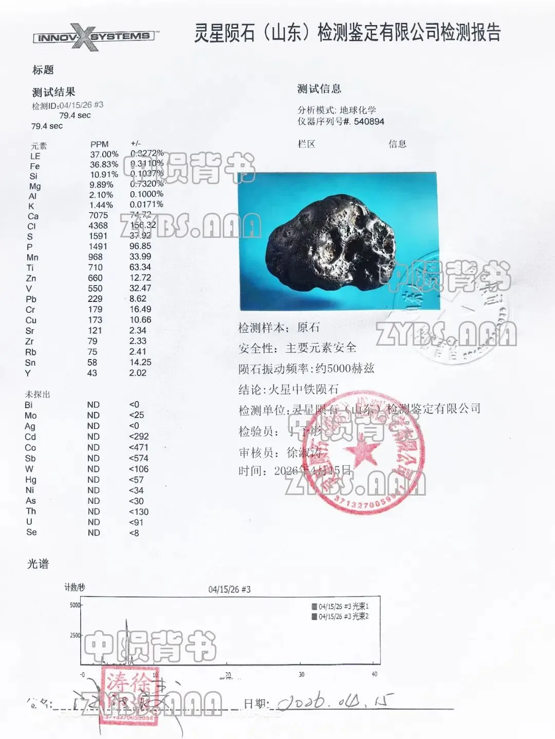 Ni(镍)未检出(ND):报告中Ni标注为ND,并非样本中不含镍,而是受仪器检测限(<34ppm)限制导致的显示问题。行业内统一以LE作为镍元素的定量结果,本次检测得出的37%镍含量,完全符合中铁陨石的镍含量标准,与主量元素检测结果相互印证,排除检测误差影响,符合光谱仪检测中“ND即低于检测限”的行业规范。