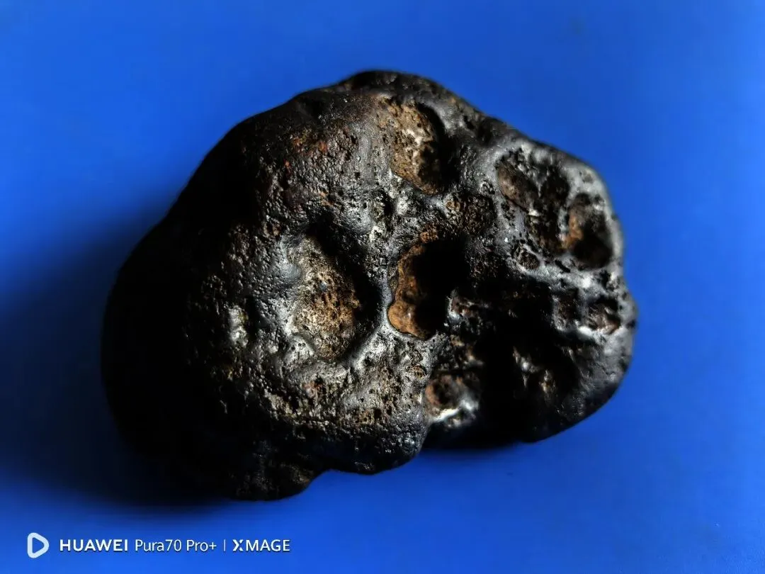 气印:熔壳表面分布有大小不均的凹坑状气印,形态不规则,无明显圆润感,符合铁陨石质地致密导致的气印特征,是高速坠落过程中气流冲击熔融表面形成的痕迹,可作为区分陨石与地球岩石的重要外观依据之一。