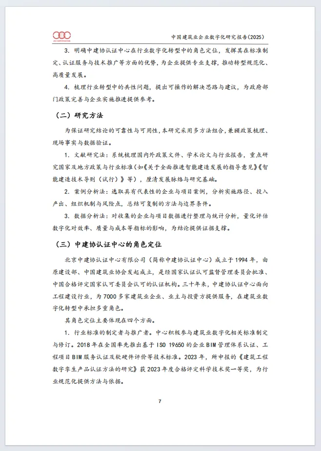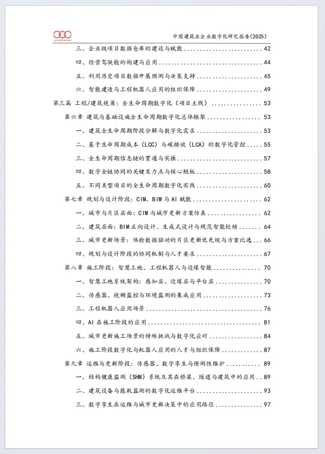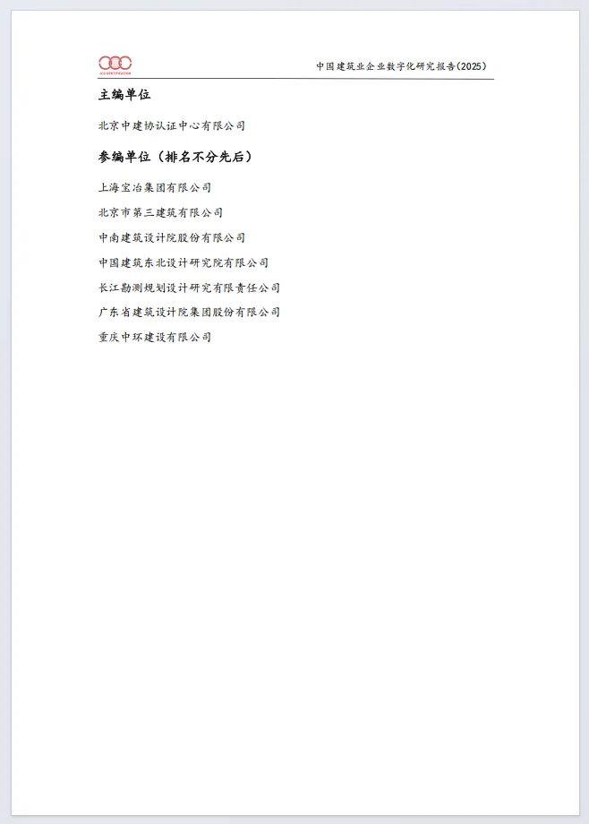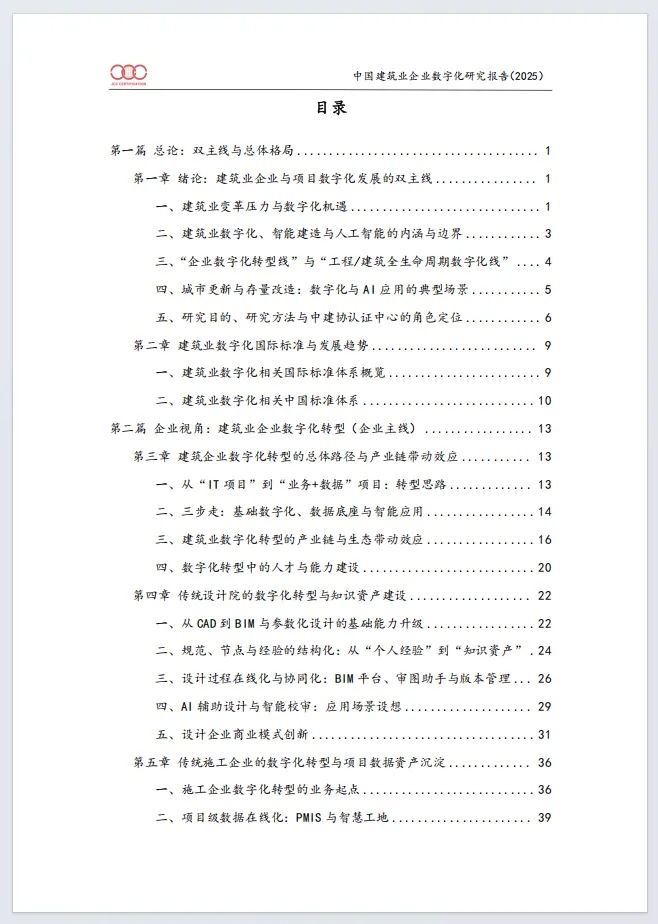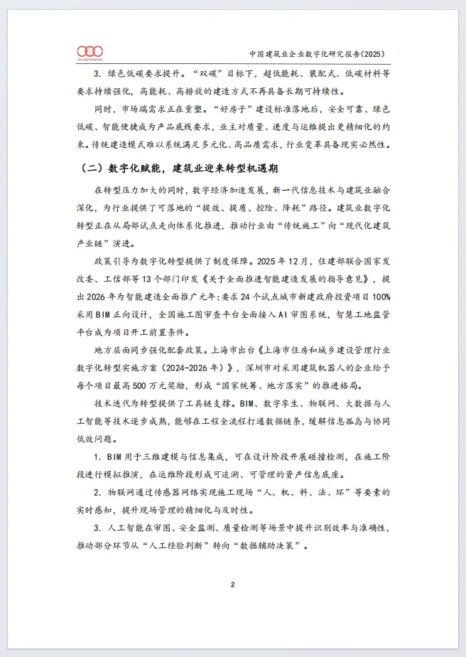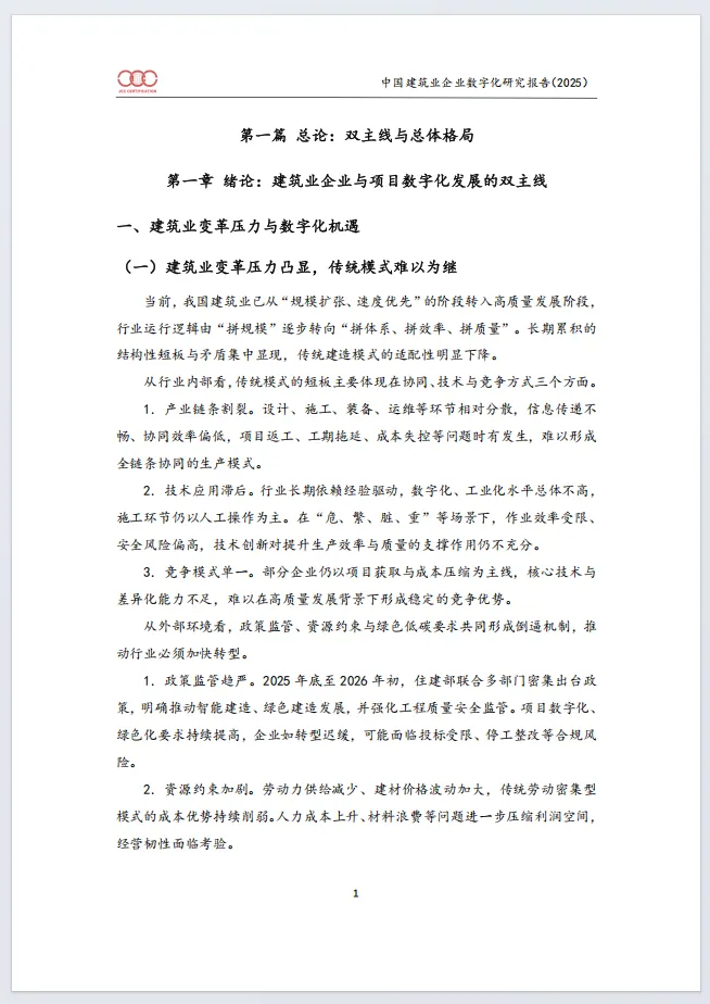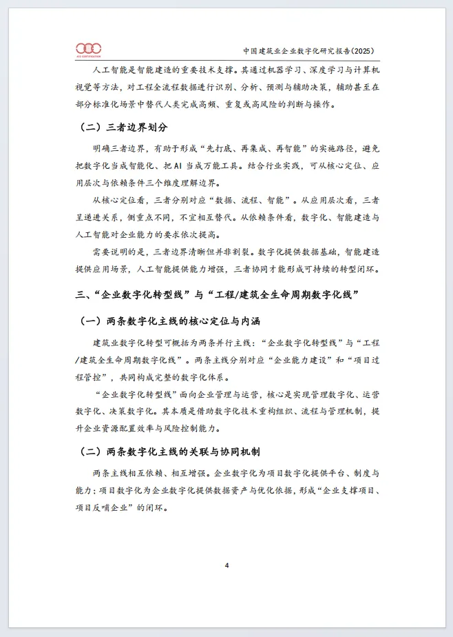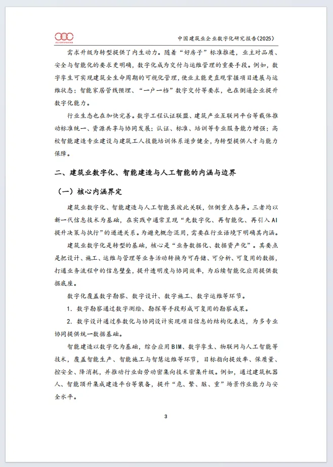 《中国建筑业企业数字化研究报告(2025)》由北京中建协认证中心编制,围绕企业数字化转型与工程全生命周期数字化双主线展开。报告界定数字化、智能建造与AI的内涵边界,梳理国内外标准体系,提出基础数字化、数据底座、智能应用三步走路径。