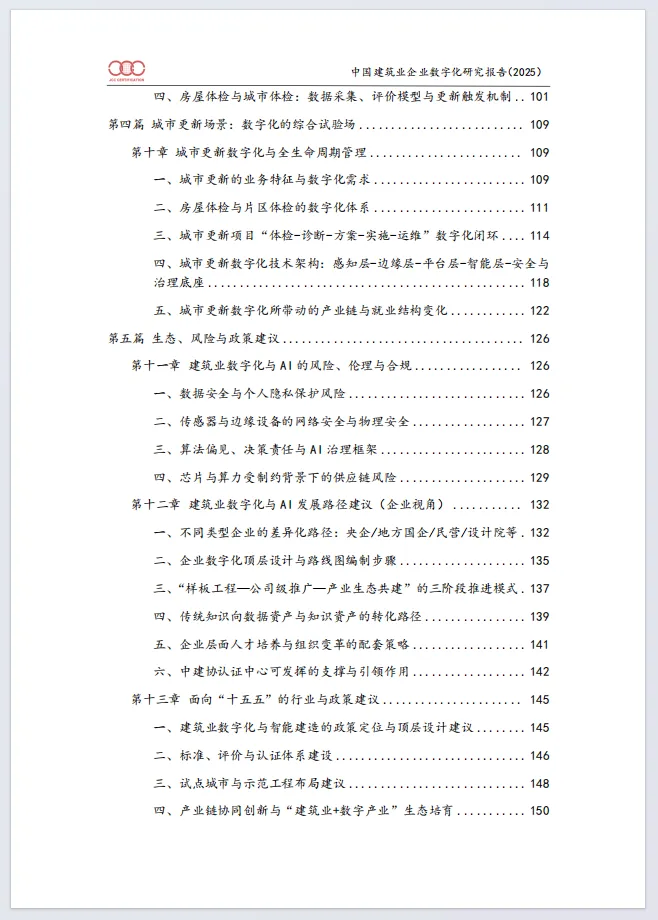 覆盖设计院、施工企业转型实践,聚焦BIM、智慧工地、工程机器人、数字孪生等核心应用,以城市更新为典型场景构建“体检—诊断—方案—实施—运维”数字化闭环。同时指出数据安全、算法偏见、芯片算力等风险,给出央企、民企、设计院差异化转型策略,建议完善标准认证、试点示范与产业链生态,为建筑业数字化落地提供全流程实操指引与政策参考。
