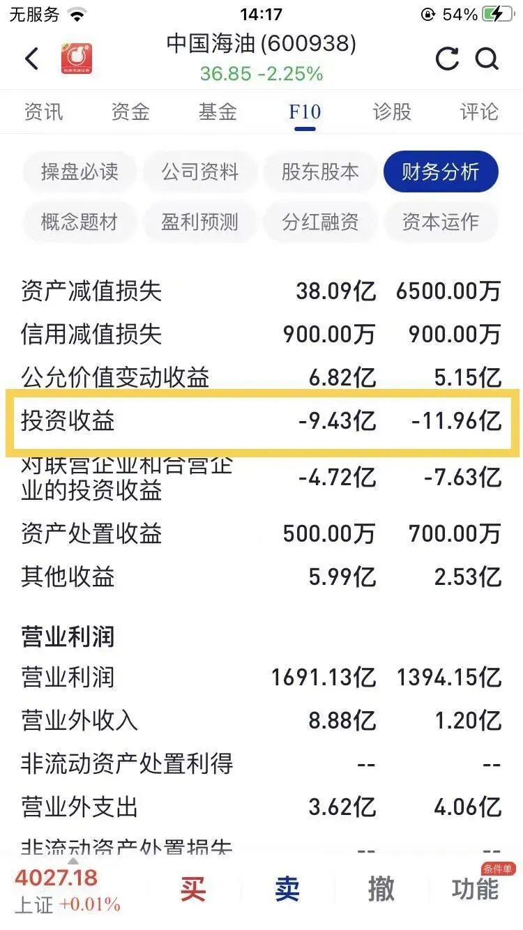 • 大白话: 这行写的不是挖油赚的钱,而是海油拿闲钱去买理财、投别的公司亏掉的钱。