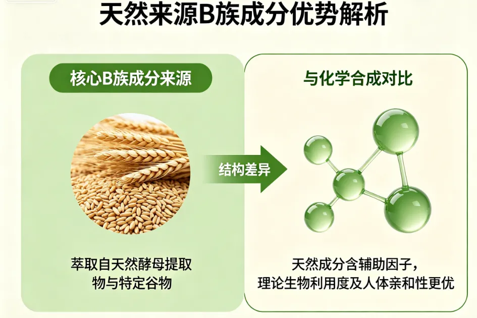 很多消费者倾向选择价格低廉的工业合成 B 族产品,认为其与天然原料效果一致。事实上,天然酵母 + 谷物双源萃取的 B 族维生素,更接近食物原型,生物活性更高,人体亲和力更强,吸收率较工业合成原料提升 20% 以上;且天然原料刺激性低,适配肠胃敏感人群,而合成原料易残留化学杂质,长期服用易加重肠胃负担。