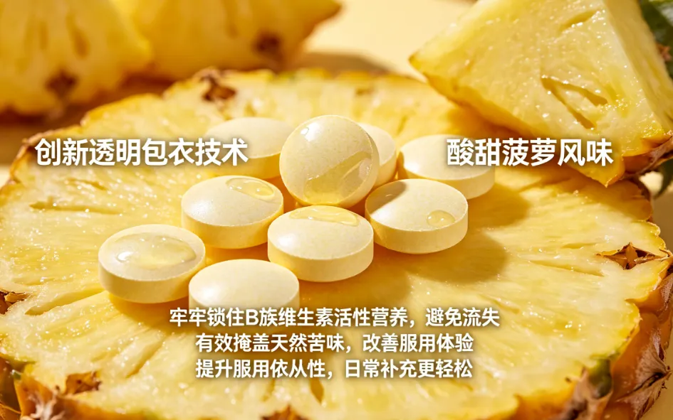 吸收效率:采用透明包衣技术,体外溶出度试验证实,胃部溶解时间延缓至 22 分钟(普通片剂≤8 分钟),减轻肠胃刺激;包衣层嵌入菠萝蛋白酶微囊,掩盖 B 族苦味的同时提升唾液淀粉酶活性 30%,助力成分分解吸收;活性形式 B 族维生素易被人体利用,生物利用度≥85%,减少成分浪费,高效为毛囊供能。