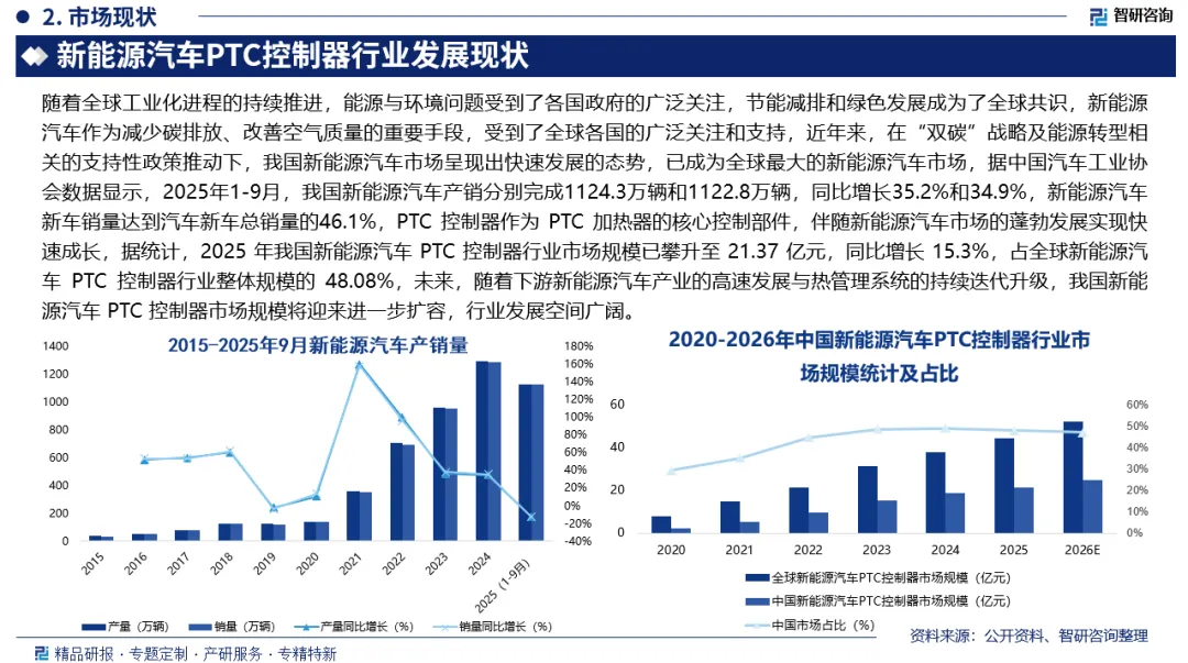 行业发展有利因素:随着全球工业化进程的持续推进,能源与环境问题受到了各国政府的广泛关注,节能减排和绿色发展成为了全球共识,新能源汽车作为减少碳排放、改善空气质量的重要手段,受到了全球各国的广泛关注和支持,近年来,在“双碳”战略及能源转型相关的支持性政策推动下,我国新能源汽车市场呈现出快速发展的态势,已成为全球最大的新能源汽车市场,据中国汽车工业协会数据显示,2025年1-9月,我国新能源汽车产销分别完成1124.3万辆和1122.8万辆,同比增长35.2%和34.9%,新能源汽车新车销量达到汽车新车总销量的46.1%,我国新能源汽车产销稳步增长为新能源汽车PTC控制器行业发展带来广阔的增长空间。