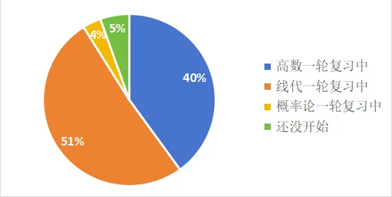 分 析:绝大多数同学已开始数学复习,但复习进度差异较大。超过一半的同学正在进行线代一轮复习,这是正常的速度,保持即可。有40%的同学在进行高数的一轮复习。从图中看出还有5%还没开始的同学,这属于复习进度的滞后。虽然大家对于复习都有自己的进度,但是临近暑期,还是保持一点紧张感最好。