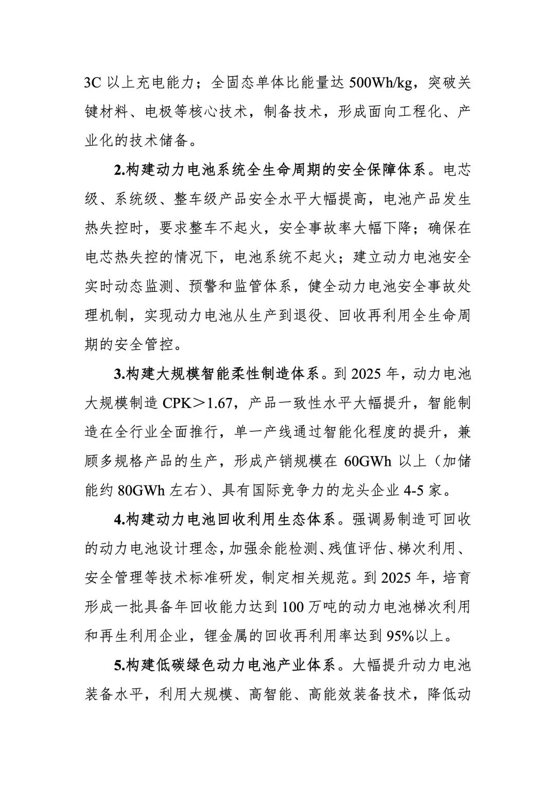 发展目标:高能效、高安全、低成本、绿色化、全球化2025 年液态电池能量密度超 350Wh/kg,成本低于 0.55 元 / Wh,-20℃容量保持率≥80%。形成 4-5 家全球龙头,单一产线年产 60GWh 以上。回收企业年处理百万吨,锂回收率≥95%。海外营收占比超 30%,构建安全、低碳、循环、全球化产业体系。