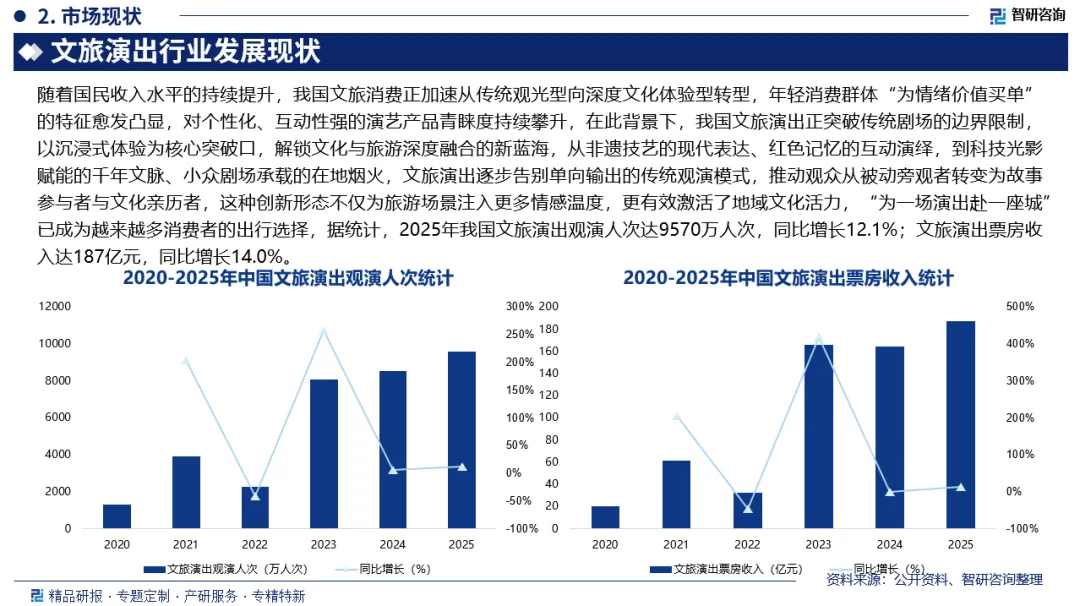 文旅演出是依托特定地域的自然景观、文化遗产、民俗风情等核心资源,以文化体验和旅游消费为双重导向,通过艺术化的舞台呈现、场景营造与互动设计,为游客提供沉浸式文化体验的演艺形式。据统计,2025年我国文旅演出观演人次达9570万人次,同比增长12.1%;文旅演出票房收入达187亿元,同比增长14.0%。