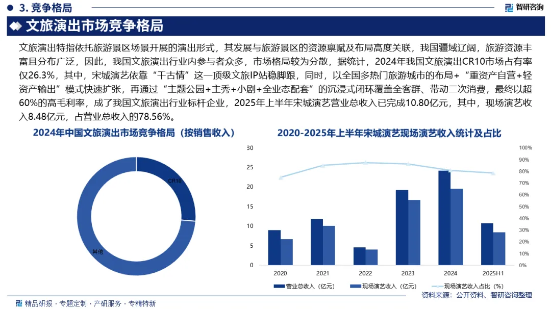 市场竞争格局:文旅演出特指依托旅游景区场景开展的演出形式,其发展与旅游景区的资源禀赋及布局高度关联,我国疆域辽阔,旅游资源丰富且分布广泛,因此,我国文旅演出行业内参与者众多,市场格局较为分散,据统计,2024年我国文旅演出CR10市场占有率仅26.3%。