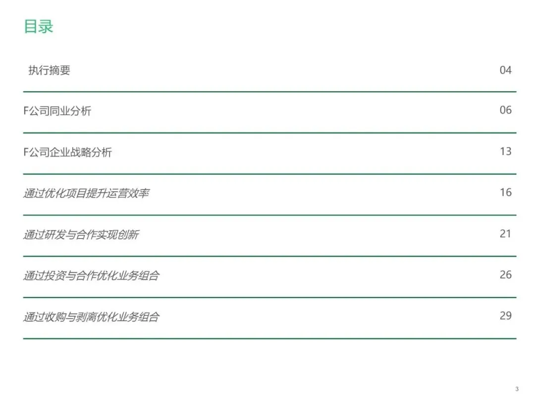 这份文件也有一个很强的实战意义:它不仅适合了解F公司,更适合拿来学习优秀战略分析报告应该怎么写。因为它既有同业财务对标,也有敏感性分析;既讨论增长目标,也检视目标实现难点;既分析投资并购,也回到运营改善和数字化转型本身。这样的结构,特别适合管理层、投资团队、战略部门,甚至咨询顾问用来快速判断一家企业到底是在“讲故事”,还是在真正提升质量。