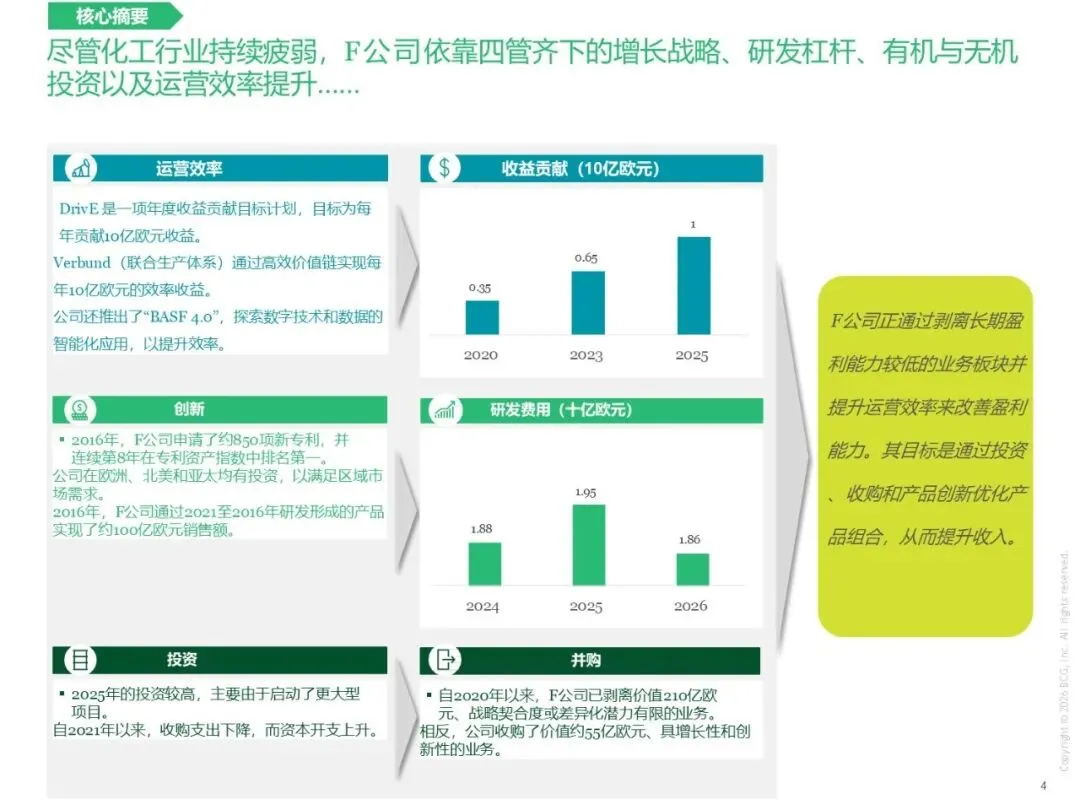 BCG出具的《F公司战略评估分析报告》的核心价值,不在于简单罗列公司动作,而在于它把一家大型化工企业“如何在行业承压期继续推动增长”这件事,拆解成了非常清晰、非常可执行的战略逻辑。报告的核心判断是:F公司并不是依赖单一增长点,而是在运营效率、产品创新、资本投入和业务组合优化四条线上同时发力,试图用“效率改善盈利、创新支撑增长、投资重塑产能、并购剥离优化结构”的组合拳,推动收入和利润双提升。