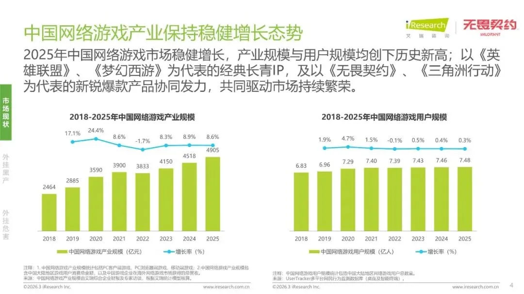 2025年中国网络游戏市场稳健增长,产业规模与用户规模均创下历史新高;以《英雄联盟》、《梦幻西游》为代表的经典长青IP,及以《无畏契约》、《三角洲行动》为代表的新锐爆款产品协同发力,共同驱动市场持续繁荣。